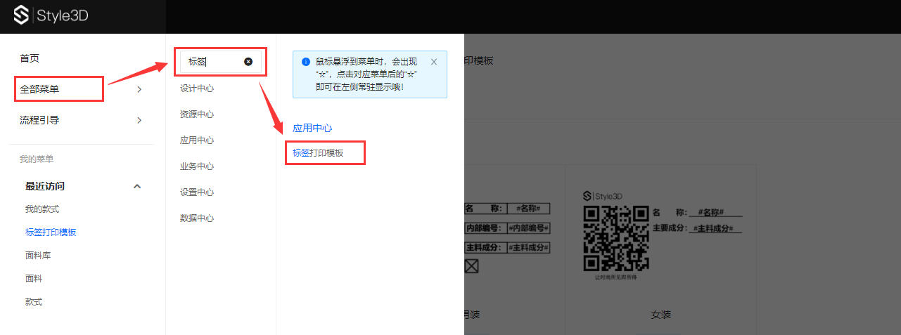点“全部菜单”,搜索“标签”,点击进入“标签打印模板”