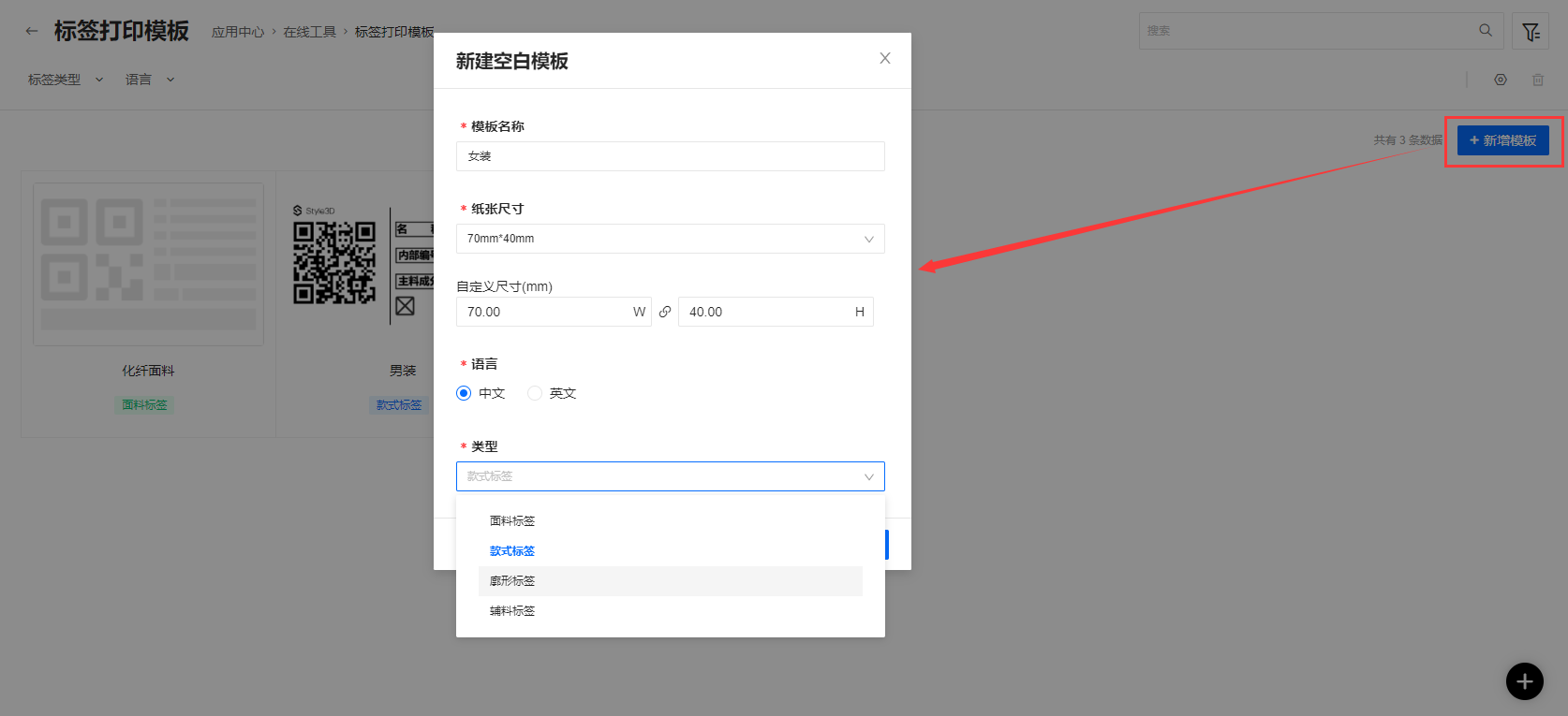 点击“新增模板”,录入模板名称、纸张尺寸、语言和类型