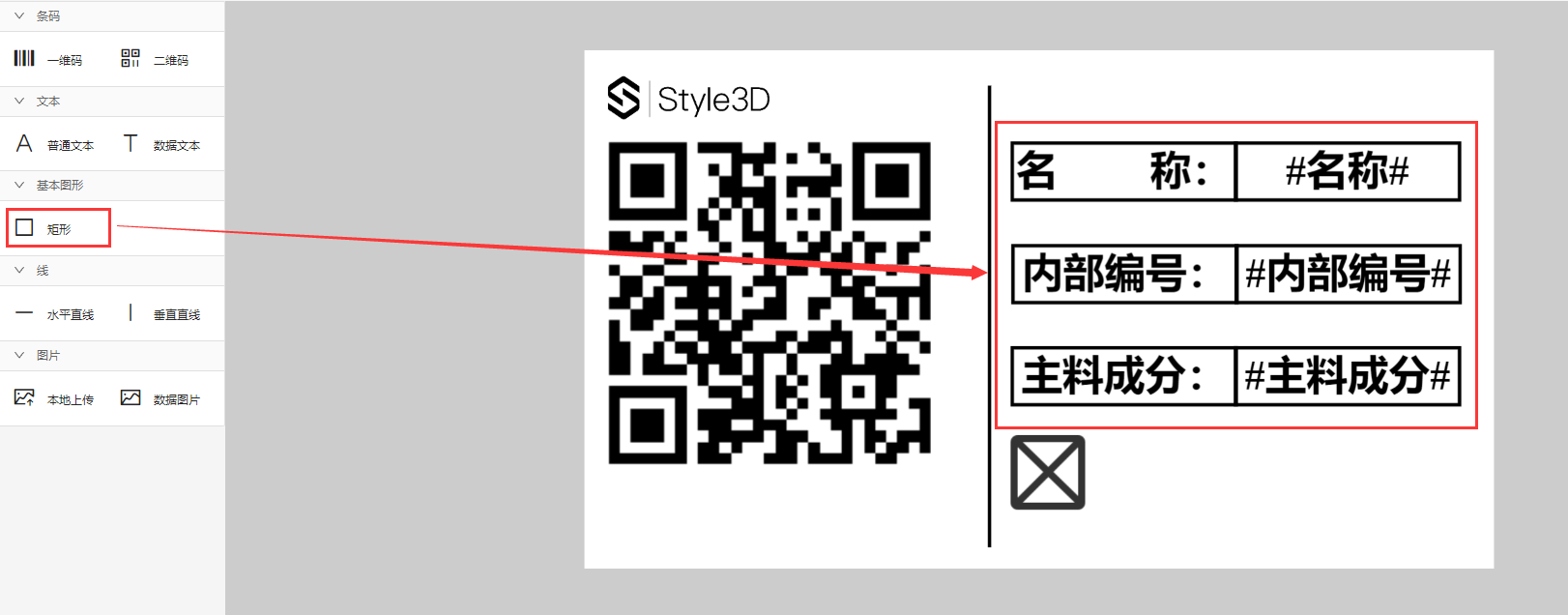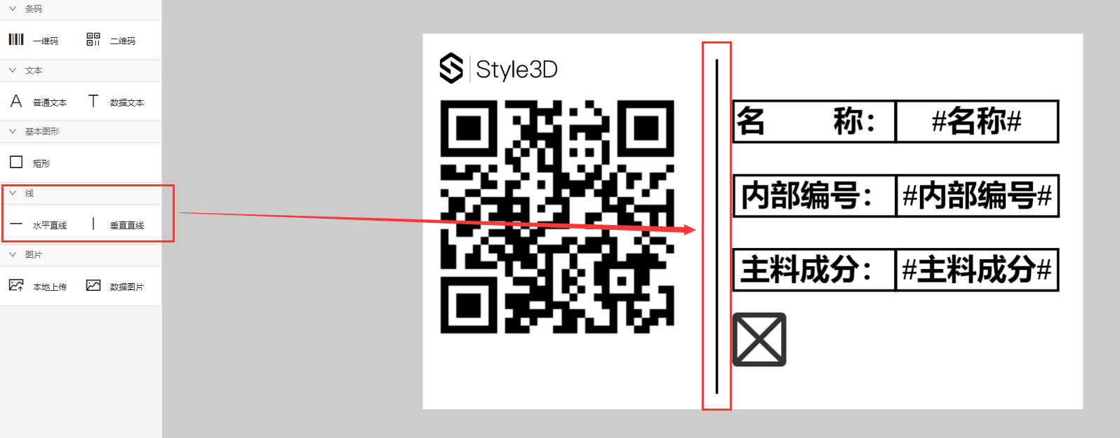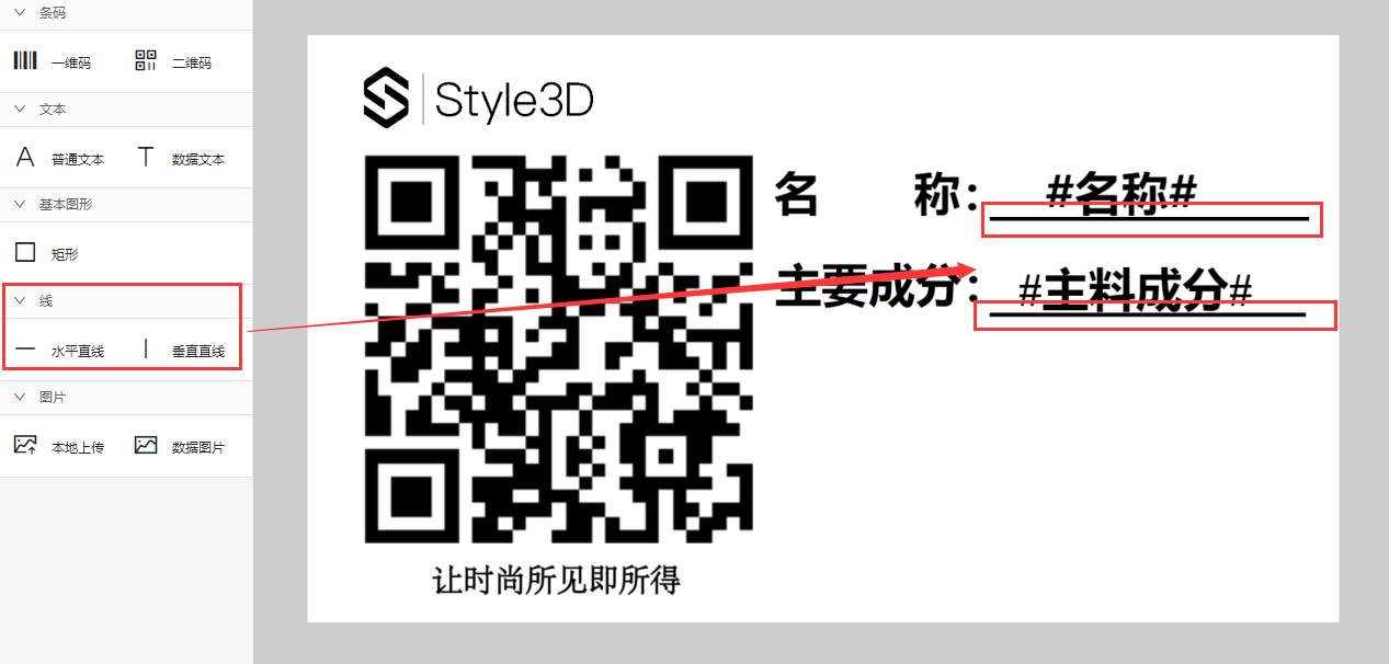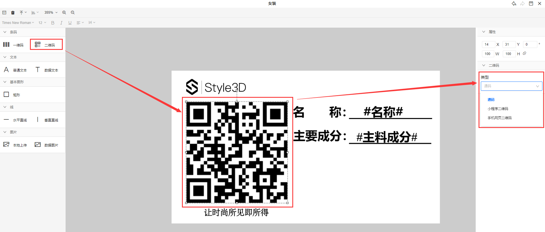 二维码可查看款式或面料详情内容,一般情况下选择二维码,拖动二维码至指定位置,二维码类型默认选择通码即可