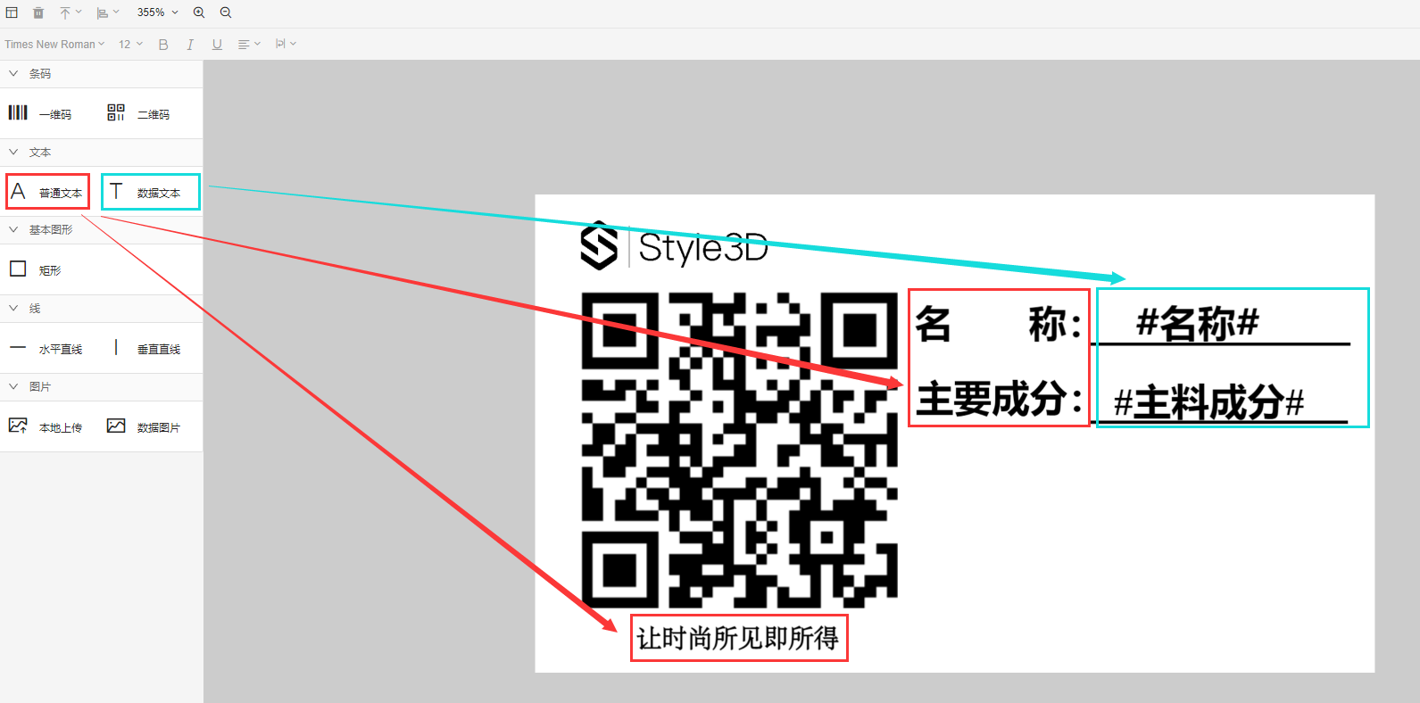 普通文本:指一些固定不变的内容,如品牌solgan、一些要展示的字段的名称