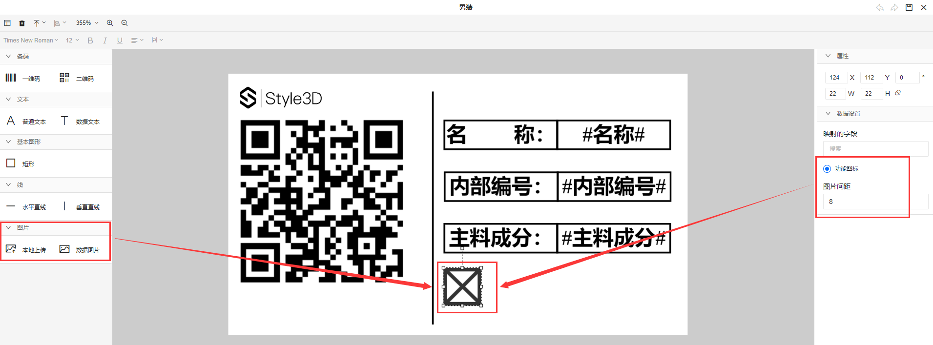 b. 数据图片:目前只有款式有这个图片类型,主要指的是功能图标,会根据款式的变化而变化,放一个上来,然后设置好图片之间的间距即可
