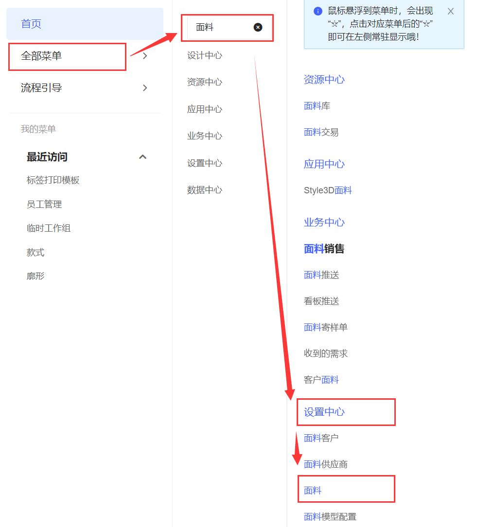 点“全部菜单”,搜索“面料”,点击进入设置中心下的面料