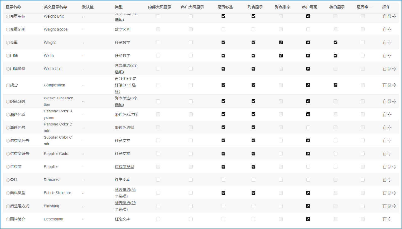 面料字段配置