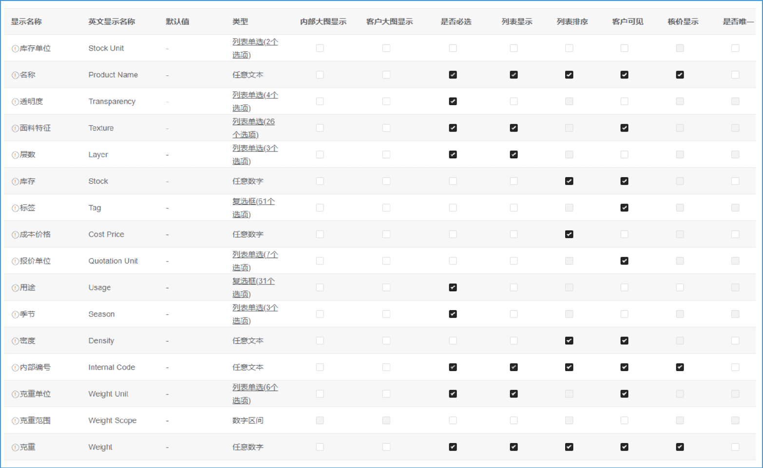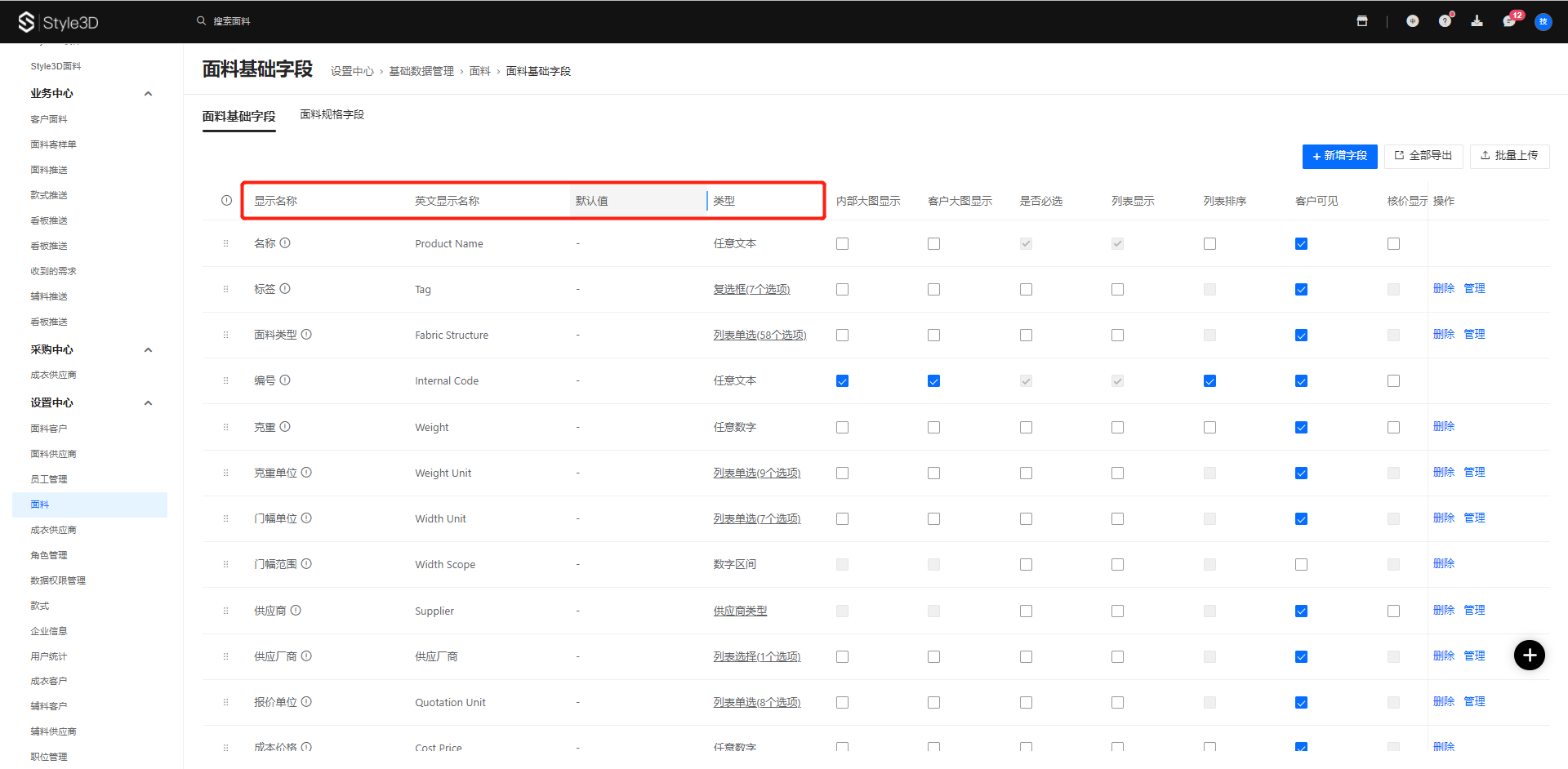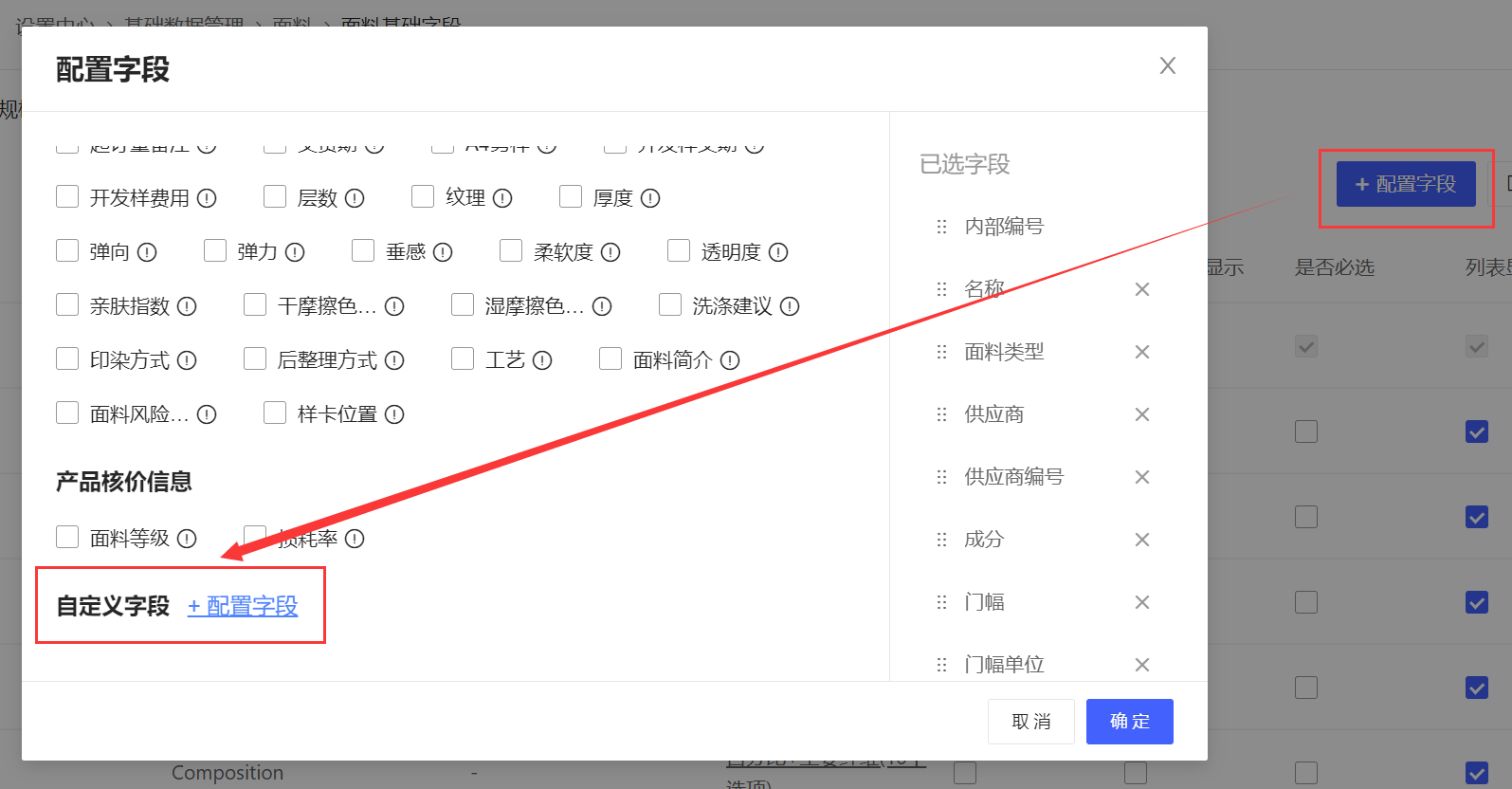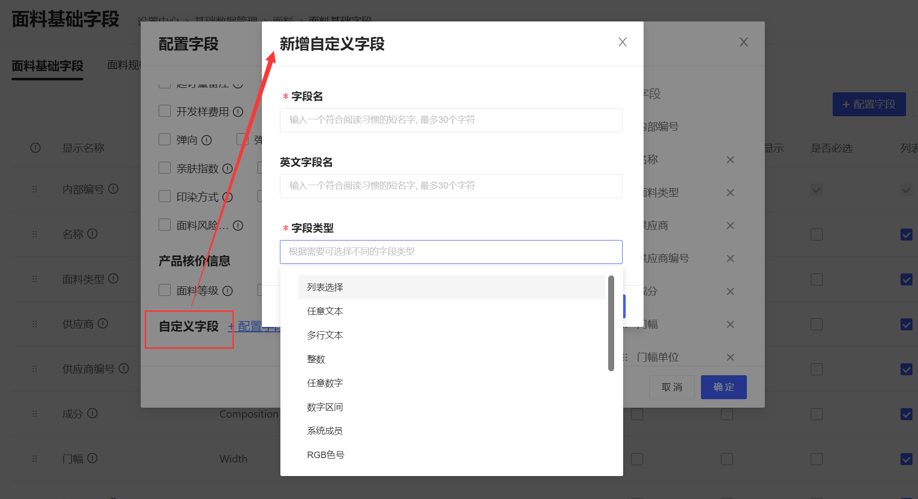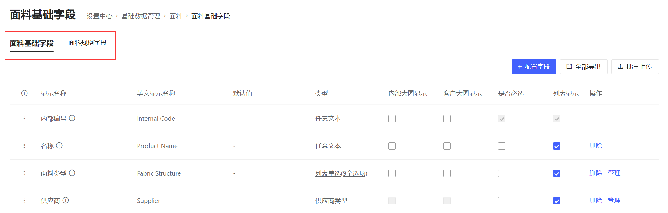 以面料基础字段为例,讲解如何配置面料字段
