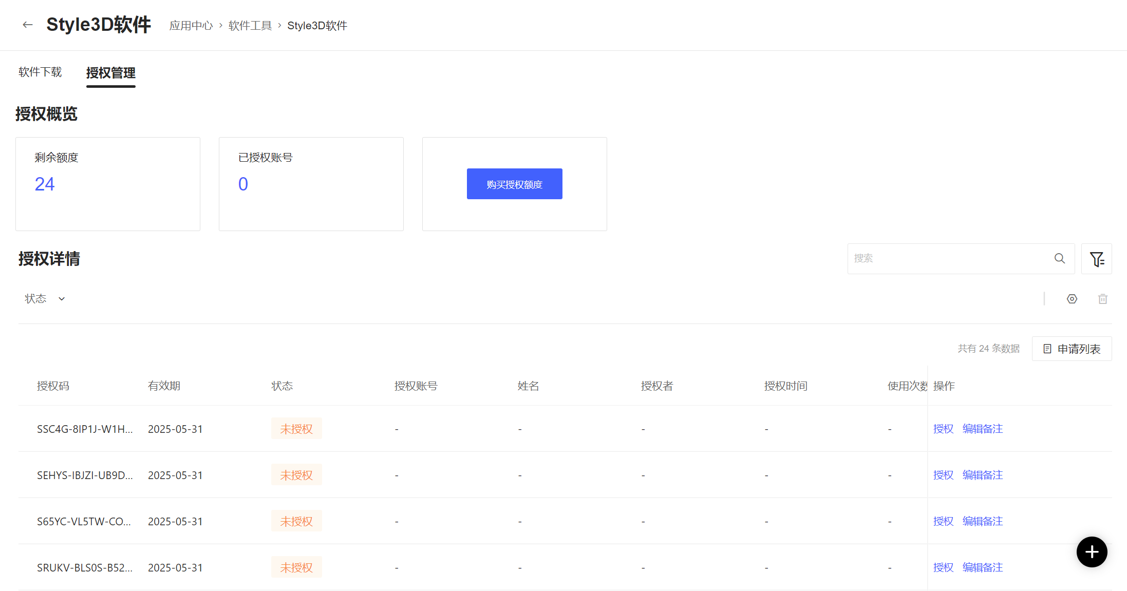点击授权管理,此页面会显示企业账号内未授权的激活码及总数量