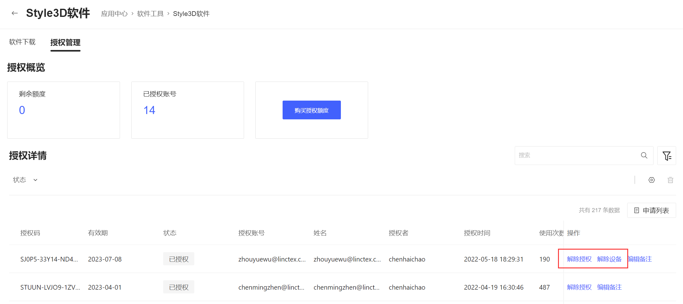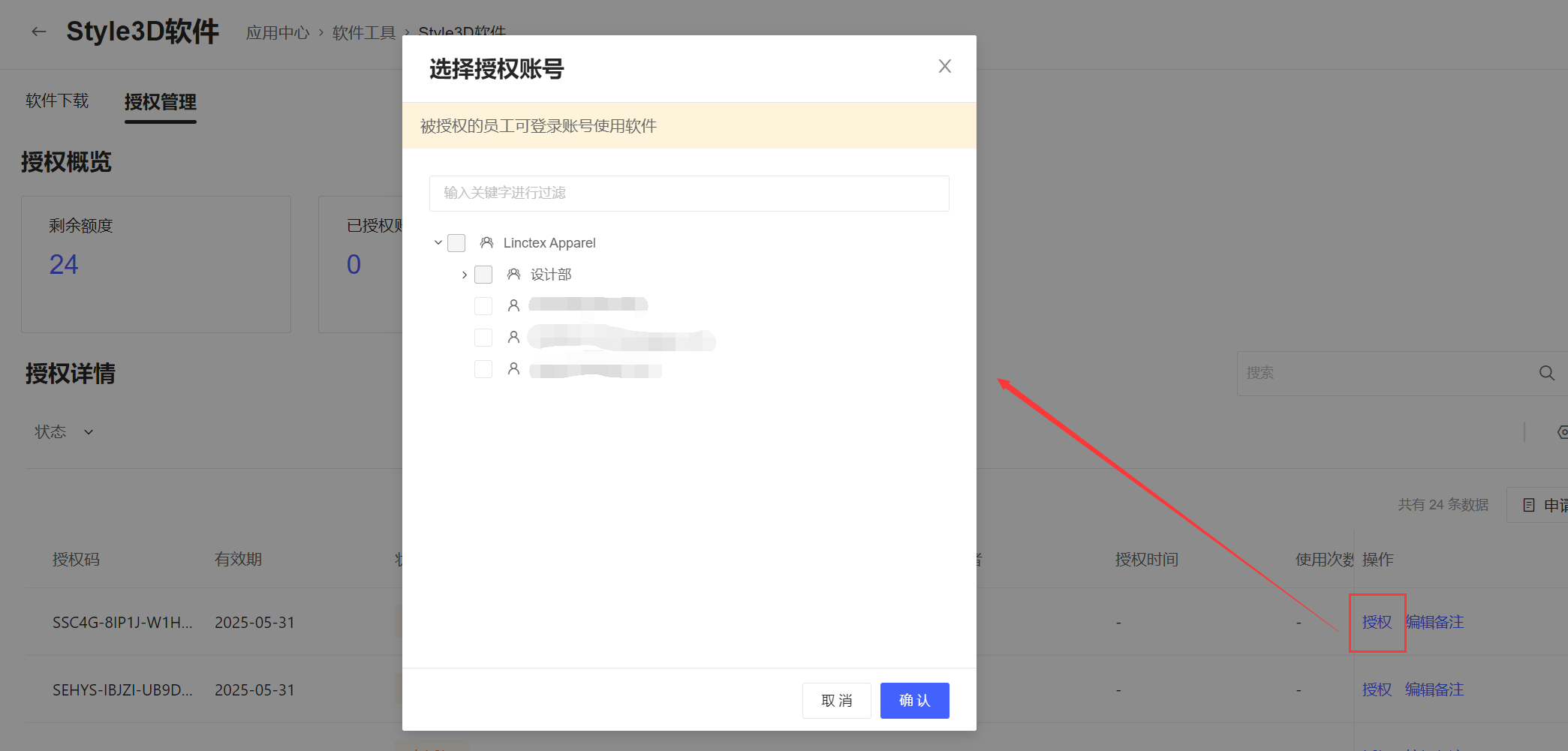 在未授权的激活码后面点击授权,选择需要授权的员工账号