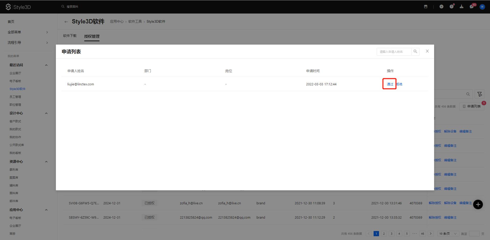 企业管理在,授权管理>申请列表,选择需要审核的员工账号,点击“通过”即可