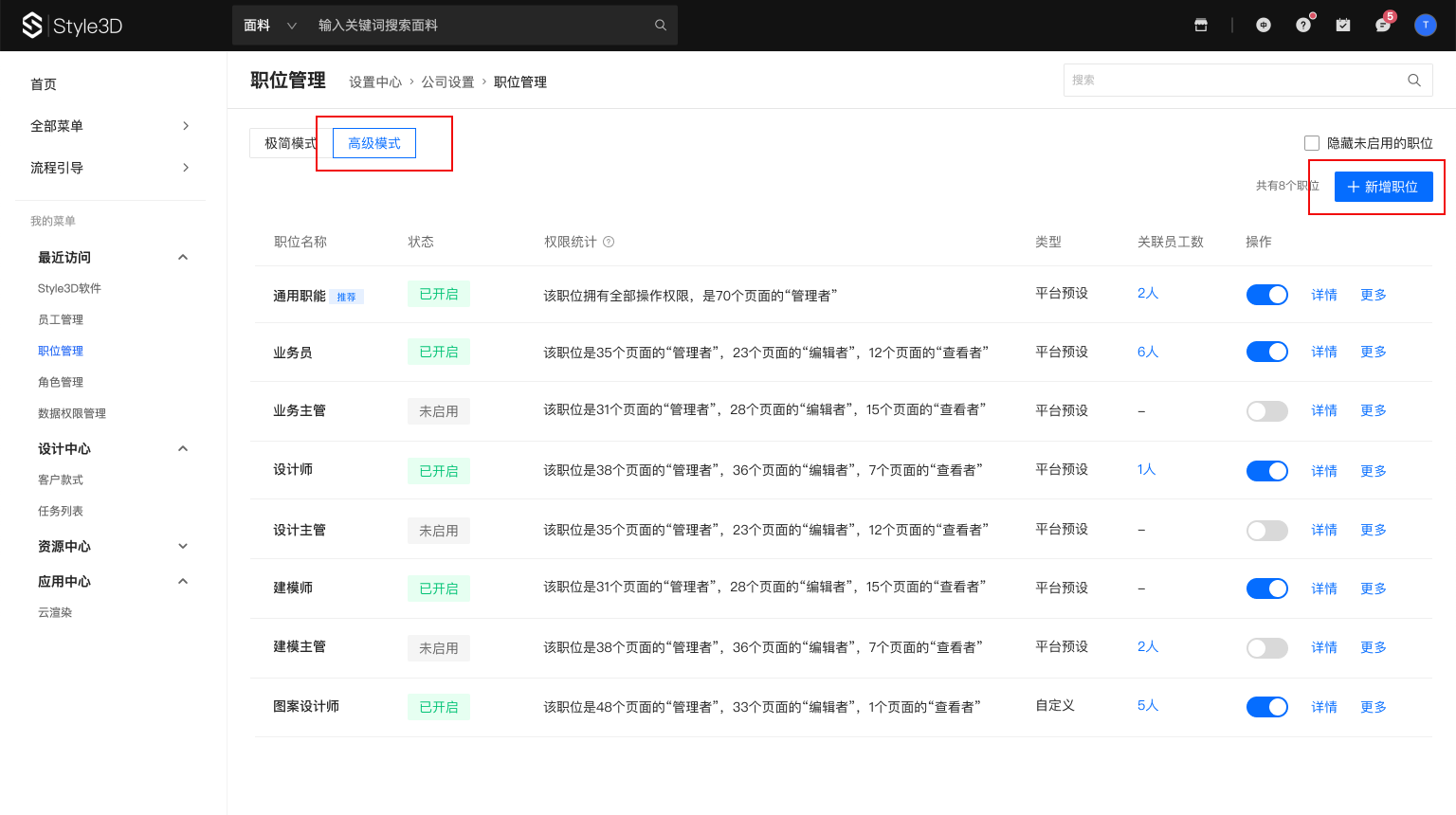 如需创建新职位,可切换至“高级模式”;除此之外,“高级模式”下还包含了删除、复制、查看关联员工等更多操作;