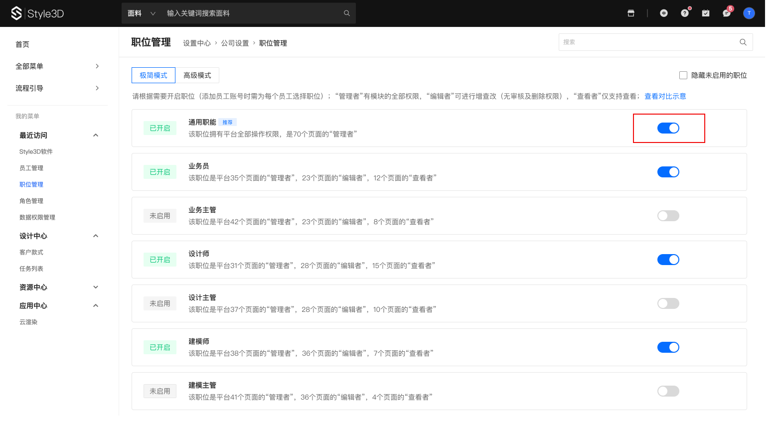 平台提前预设了多个职位,并自动将常用职位进行开启;在极简模式下,只需确认开启项是否满足需求,即可快速完成职位设置;
