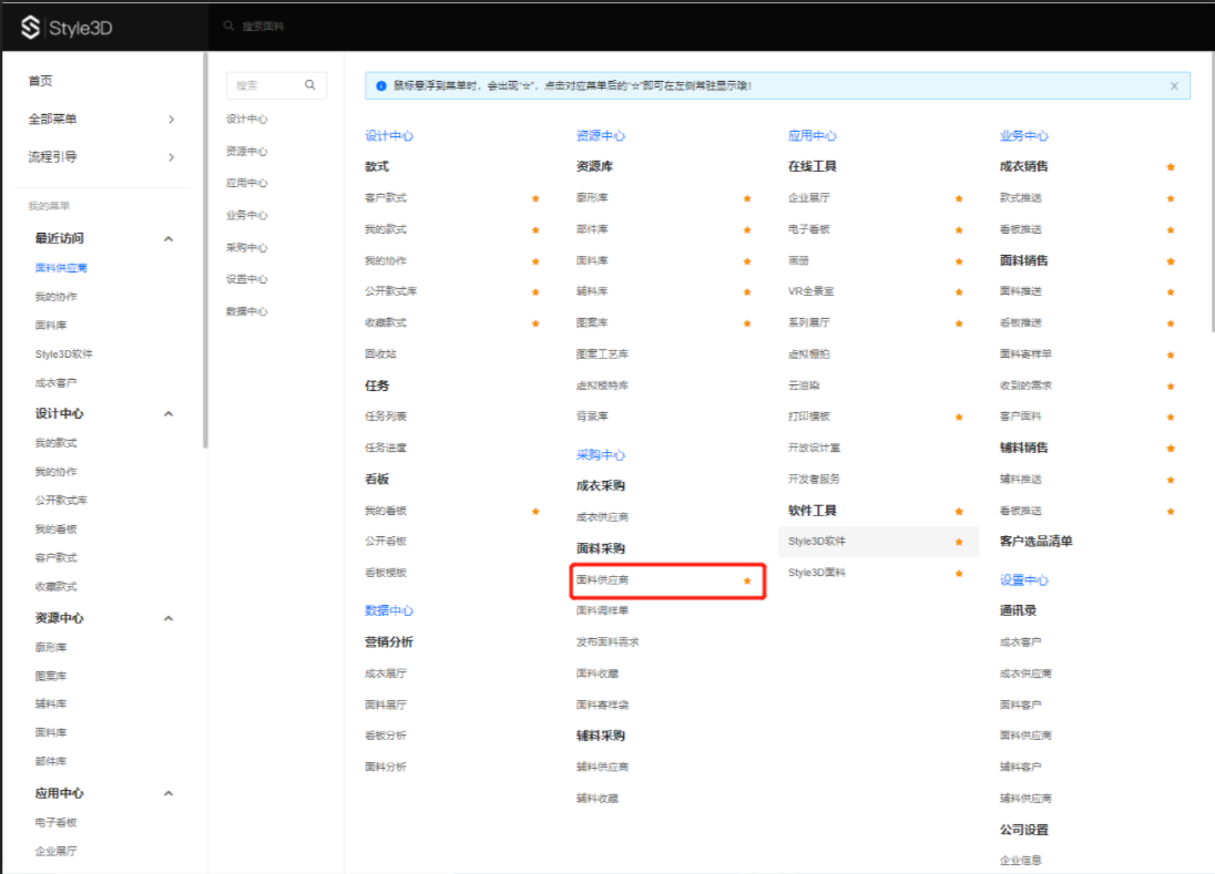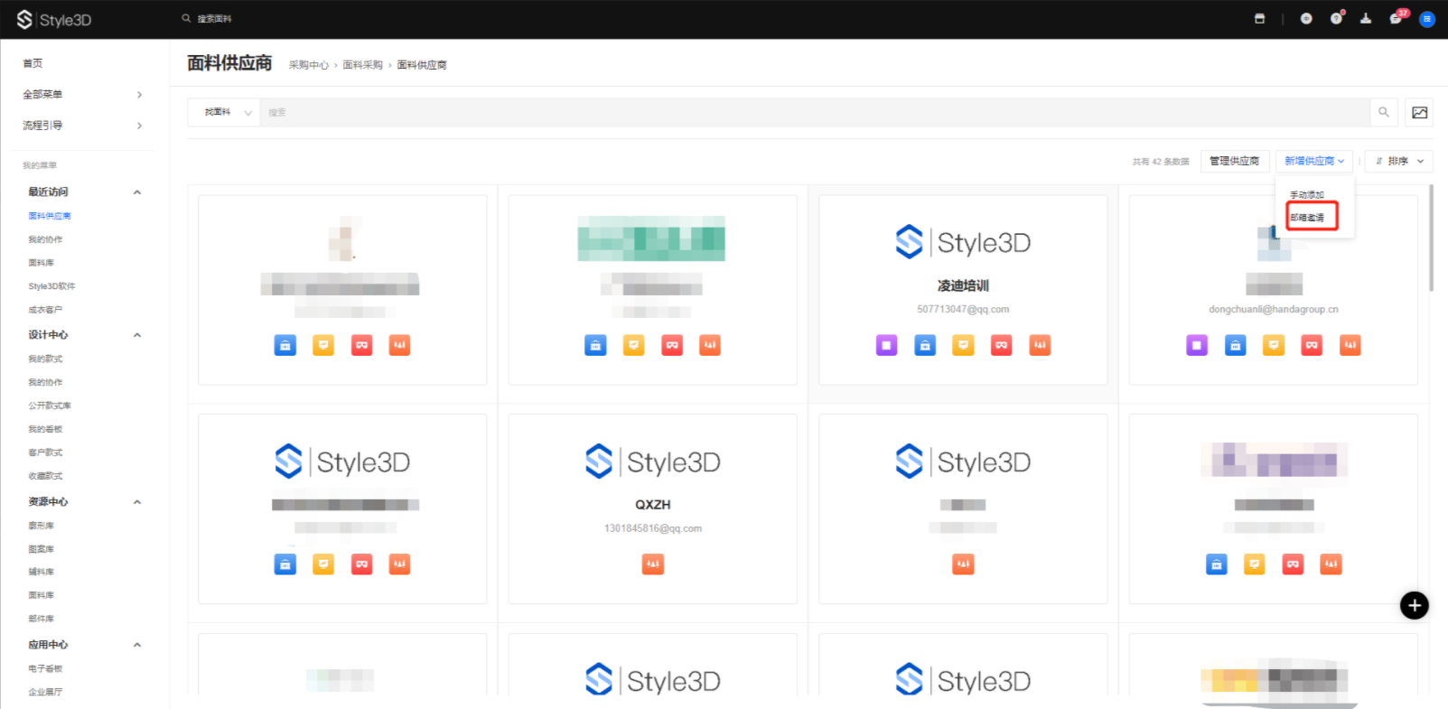 1.点击采购中心-面料供应商,进入面料供应商页面
