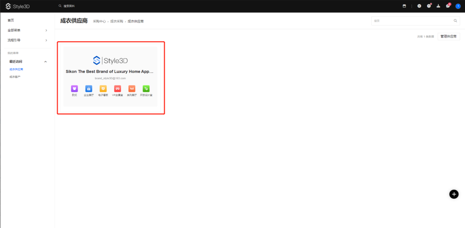 3.客户点击采购中心-成衣供应商,能看到选择的成衣供应商,点击进入能看到电子看板处有一个推送消息