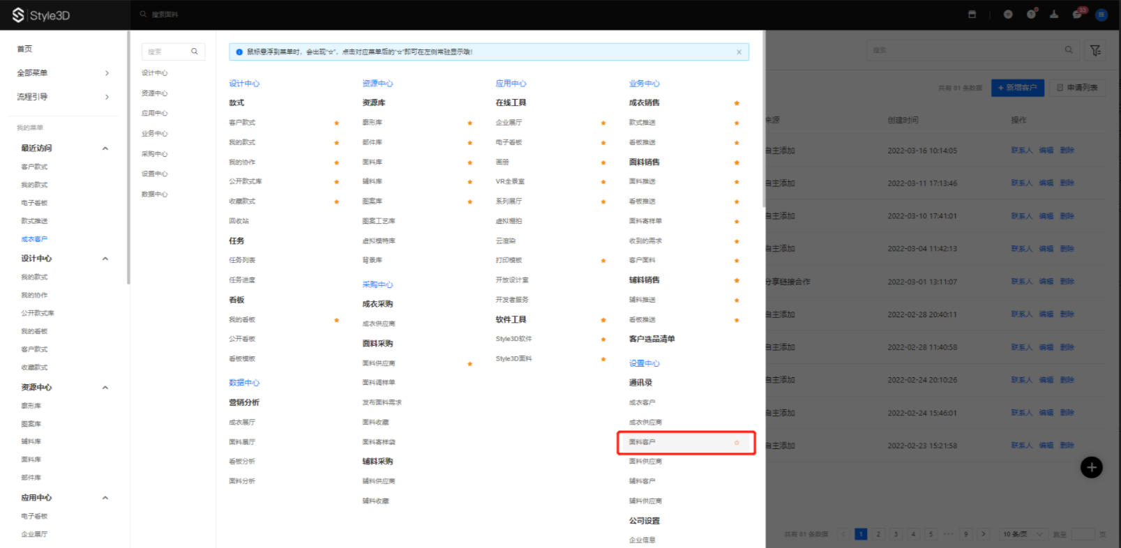 1.点击设置中心-通讯录-面料客户