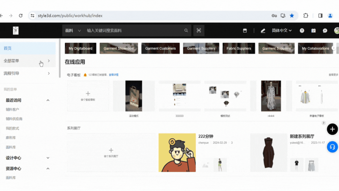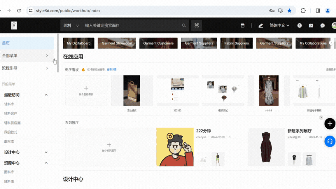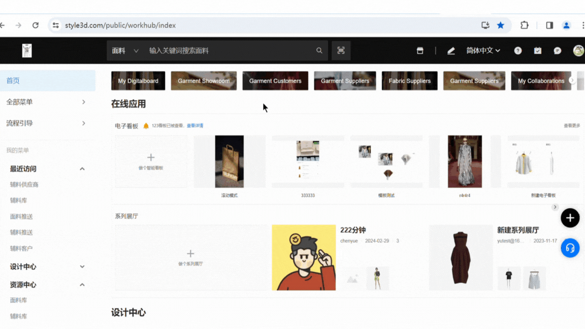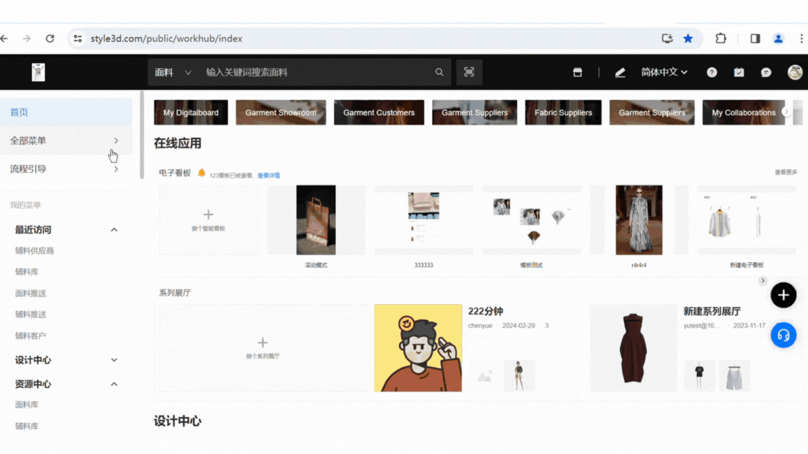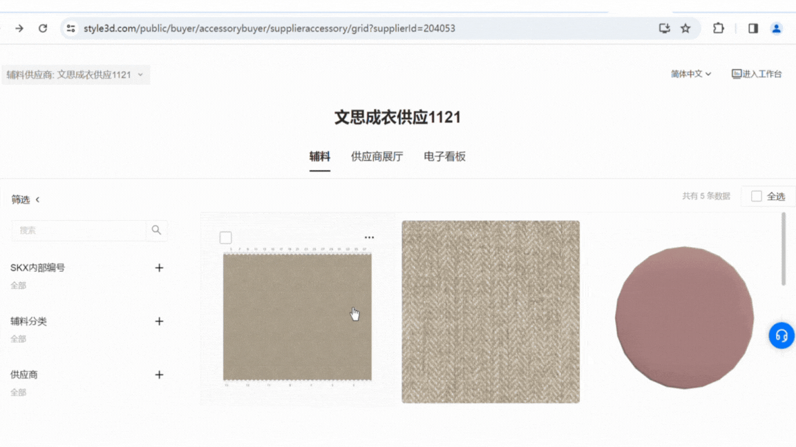 在供应商完成上述步骤后,采购商可以前往 采购中心 -> 辅料采购 ->辅料供应商,查看对应辅料供应商的主页。在“辅料”一栏中可查看到被推送的辅料。点击辅料缩略图可查看3D详情,右侧简介栏可以看到辅料的具体细节介绍。
