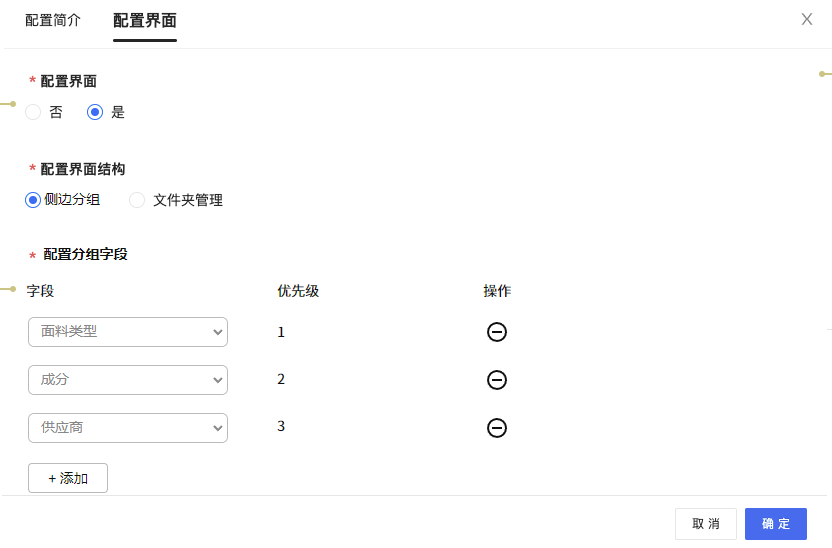 1. 设置中心面料字段中已启用的面料基础字段,面料规格字段不参与配置左侧分组