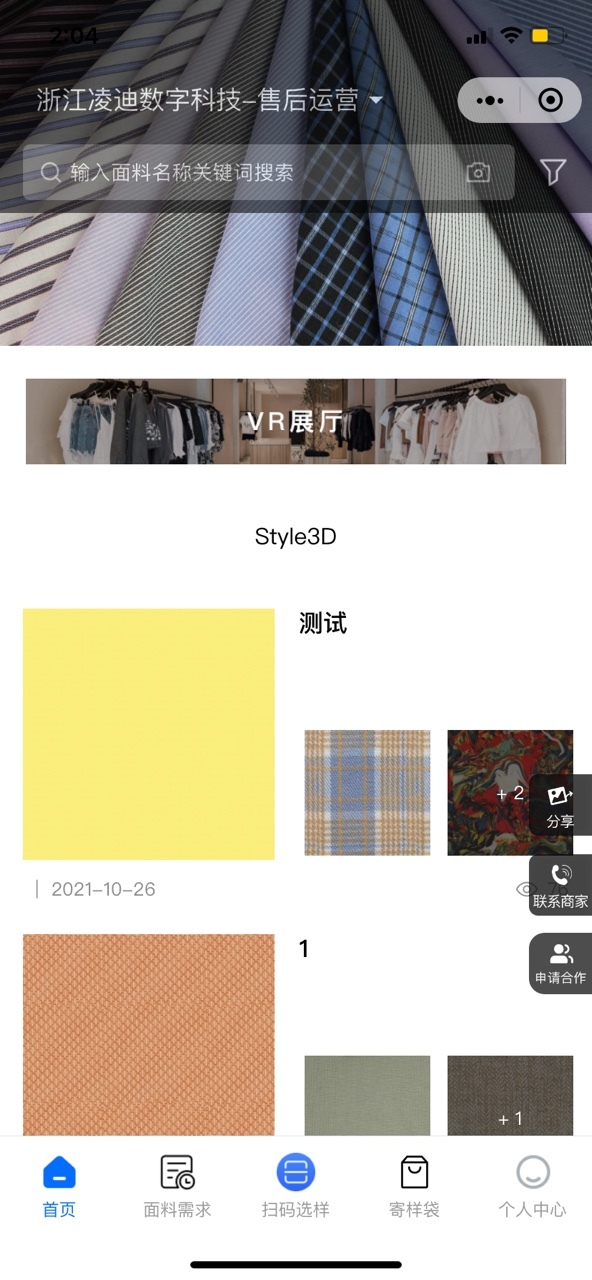 2.如果进入单块面料的详情页,需右滑界面回退到面料企业展厅,进入面料企业展厅后,点击申请合作按钮