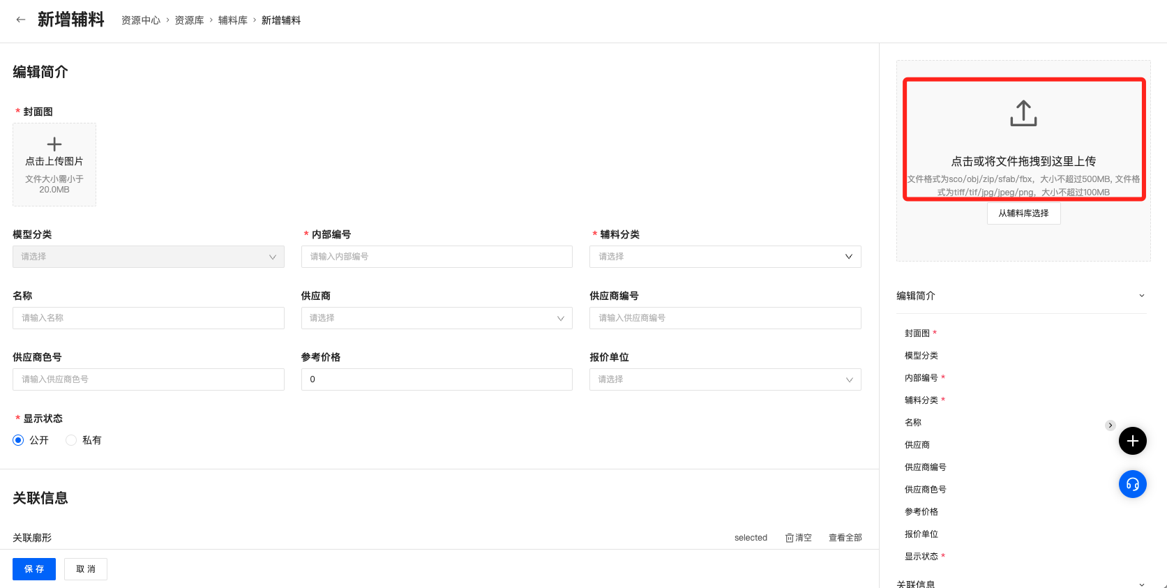 在平台的辅料库中新增辅料:在右上角的3D模型管理位置上传第一步中导出的sco或其他可读格式文件