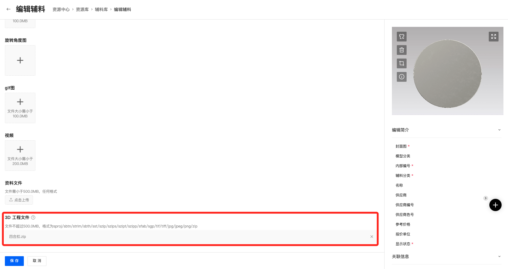 在3D工程文件处上传第二步压缩好的zip文件,填写需要的字段信息后保存即可。