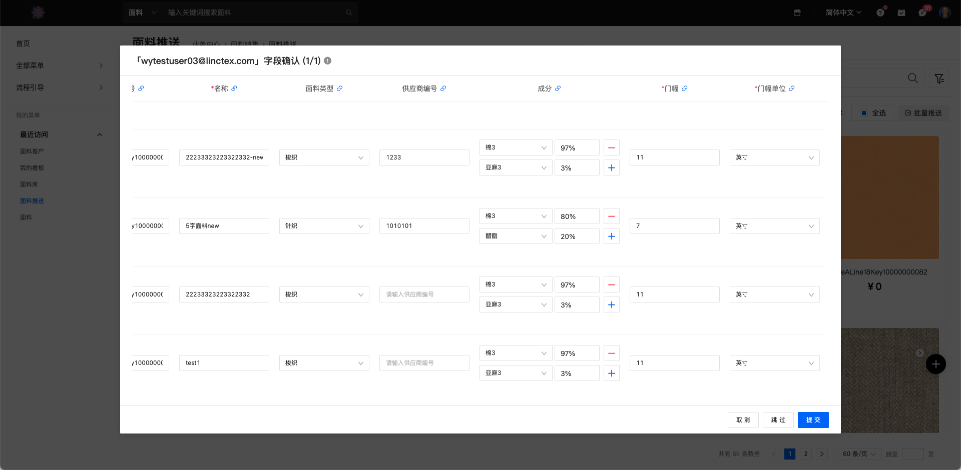 条件3:面料推送时,有存在使用的门幅单位与采购商默认值不一致的面料