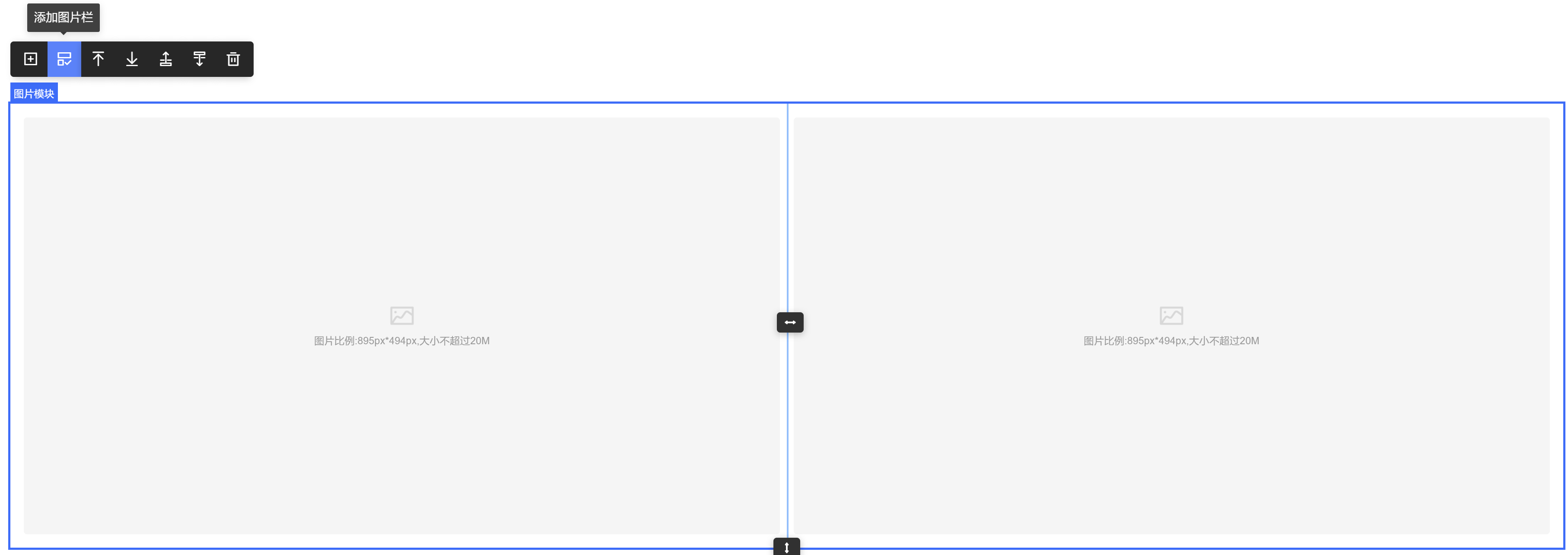 企业展厅和系列展厅支持添加更多图片栏。选中展厅里已添加的图片模块,会自动出现一系列模块管理按钮,点击第二个按钮“添加图片栏”,可添加更多图片栏,一个模块最多添加4栏。