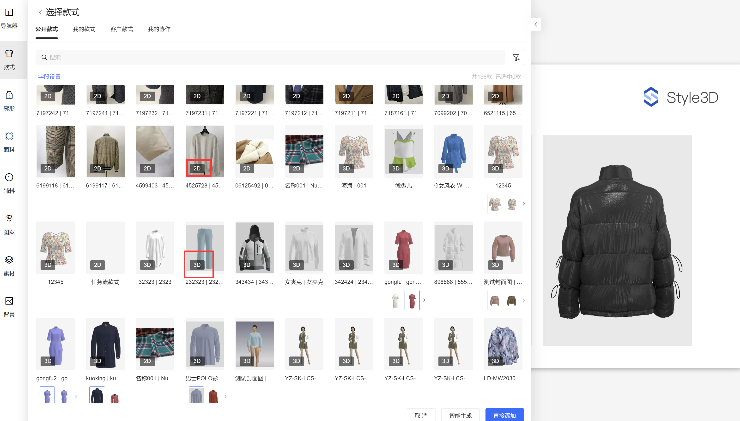 针对“没有渲染图的3D款式”,用户可以选择添加到智能看板,系统会使用3D款式的封面图生成看板。