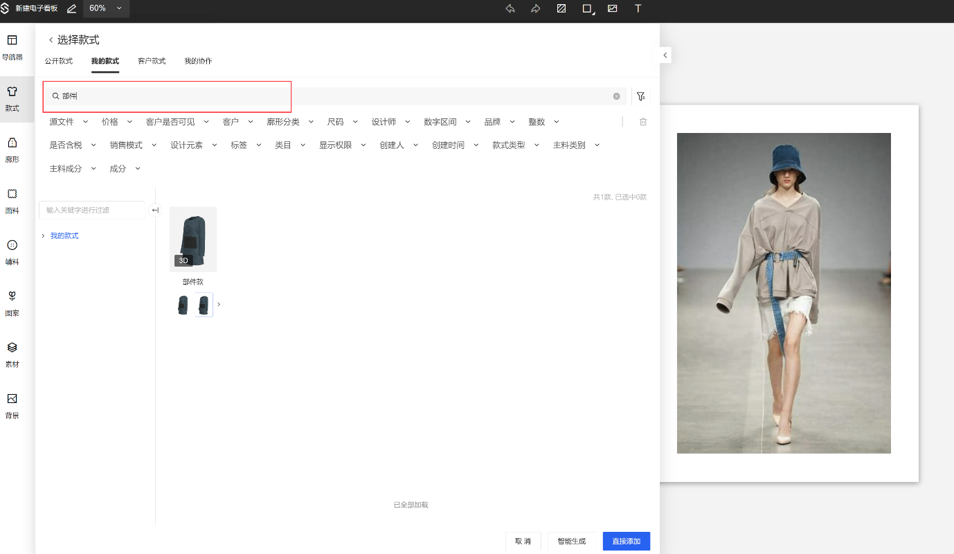 款式搜索范围包括:我的款式、客户款式、我的协作以及公开款式库,廓形搜索范围是廓形库。