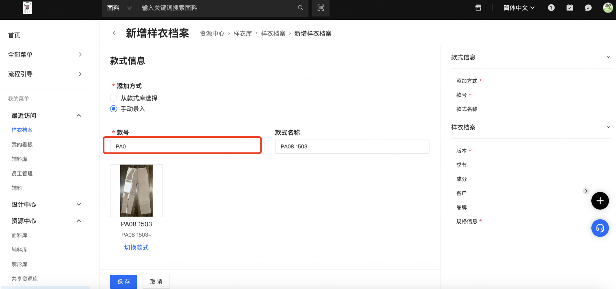 新增样衣档案时,选择【手动录入】添加方式,输入款号,支持款号模糊匹配