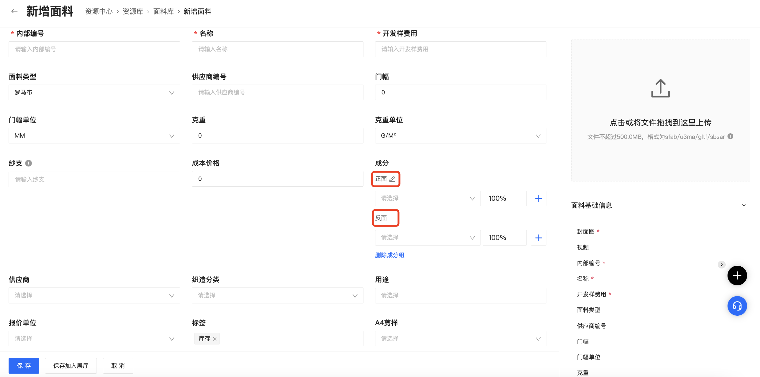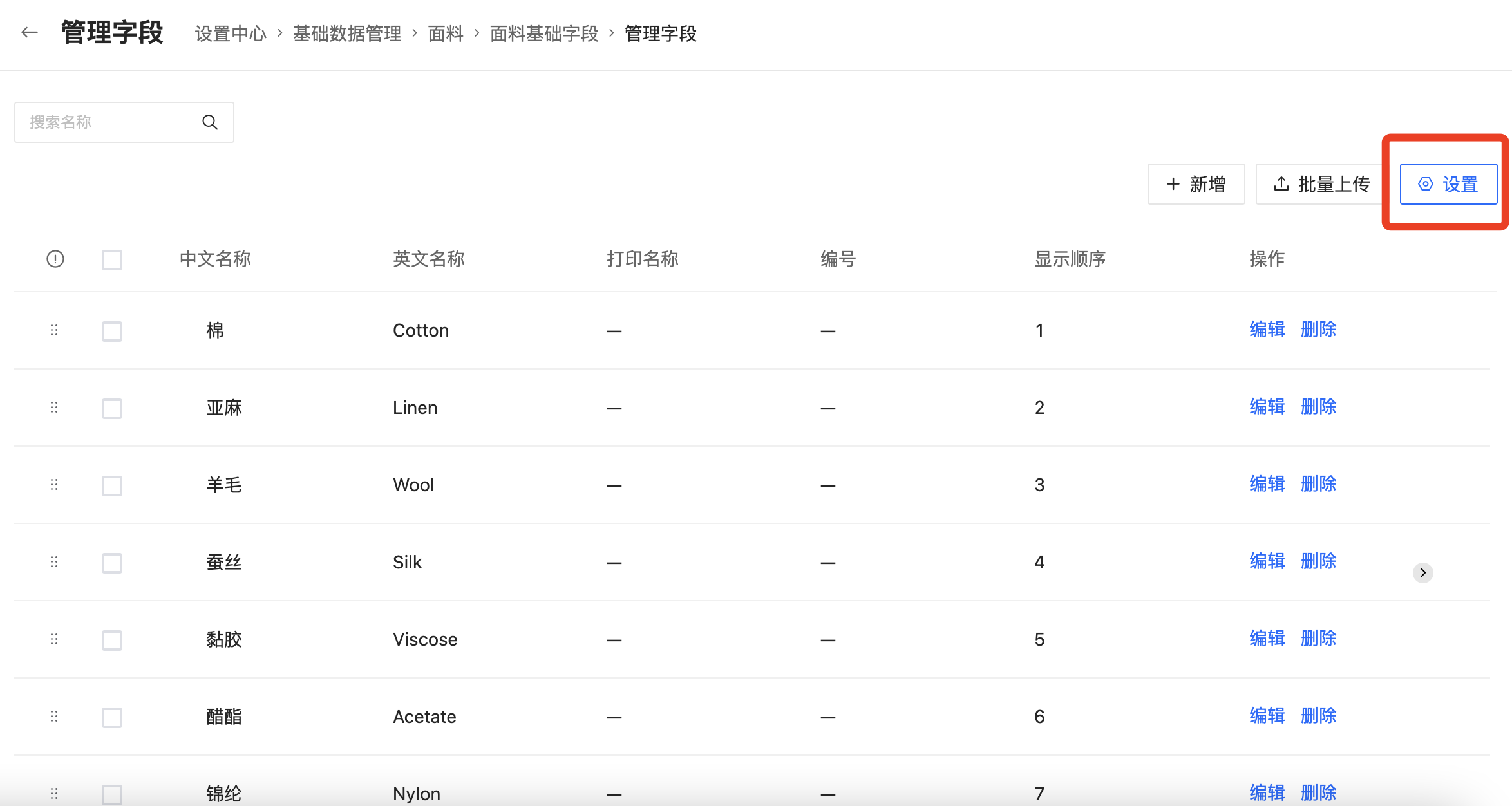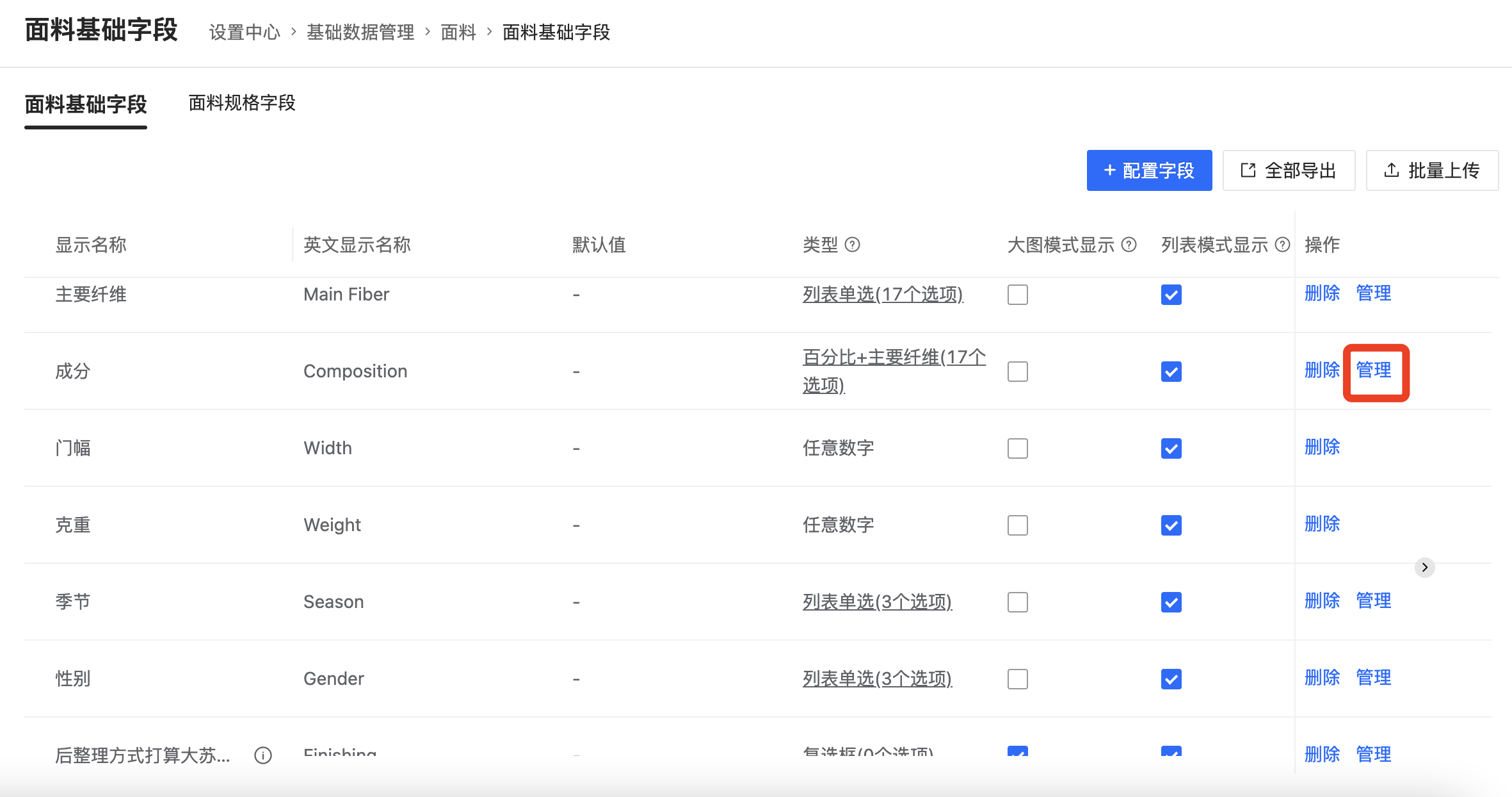位置:设置中心>基础数据管理>面料>面料基础字段
