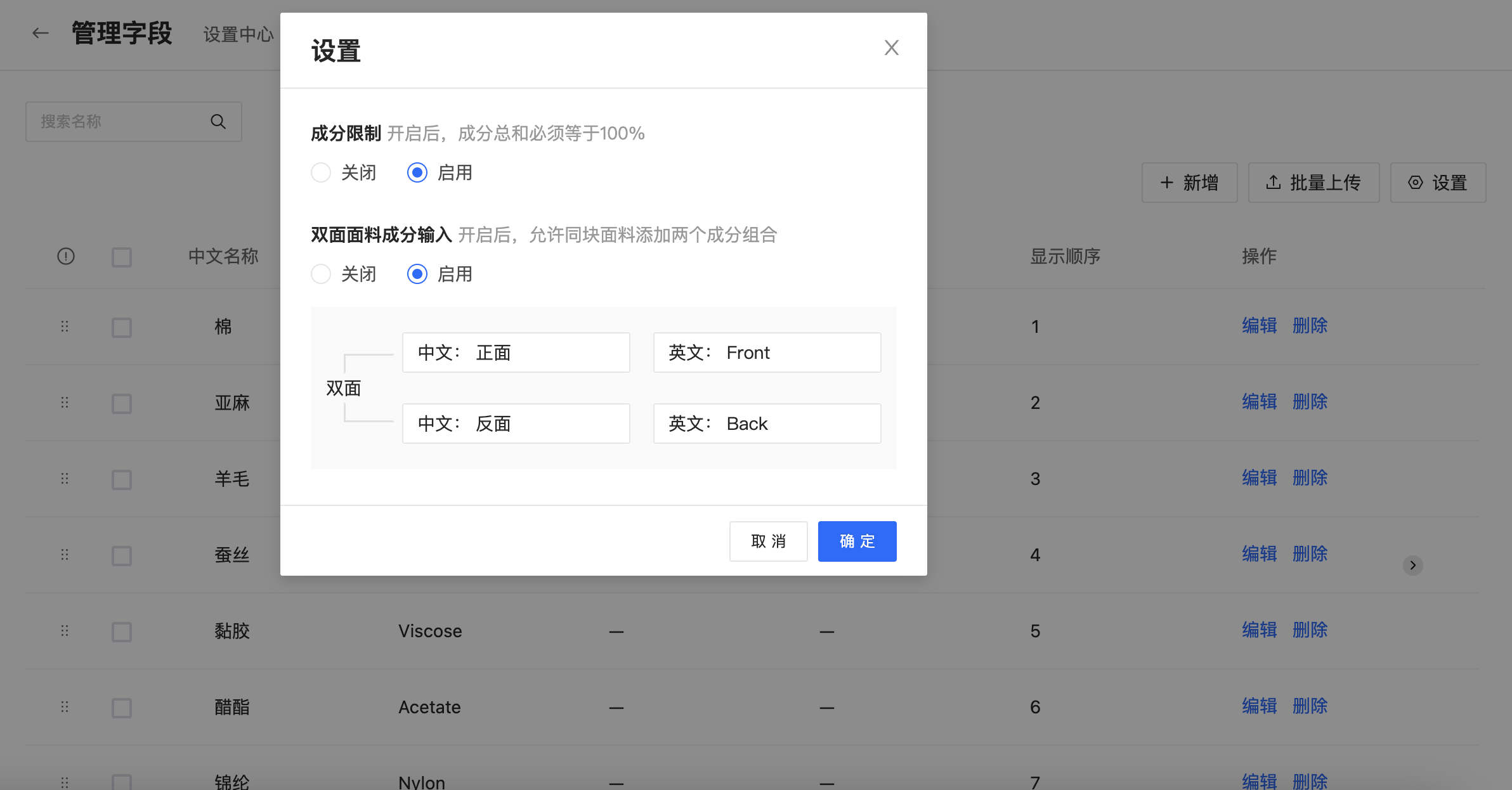 优化:双面面料成分的“正面”&“反面”可被批量编辑(优化前只允许单个编辑)