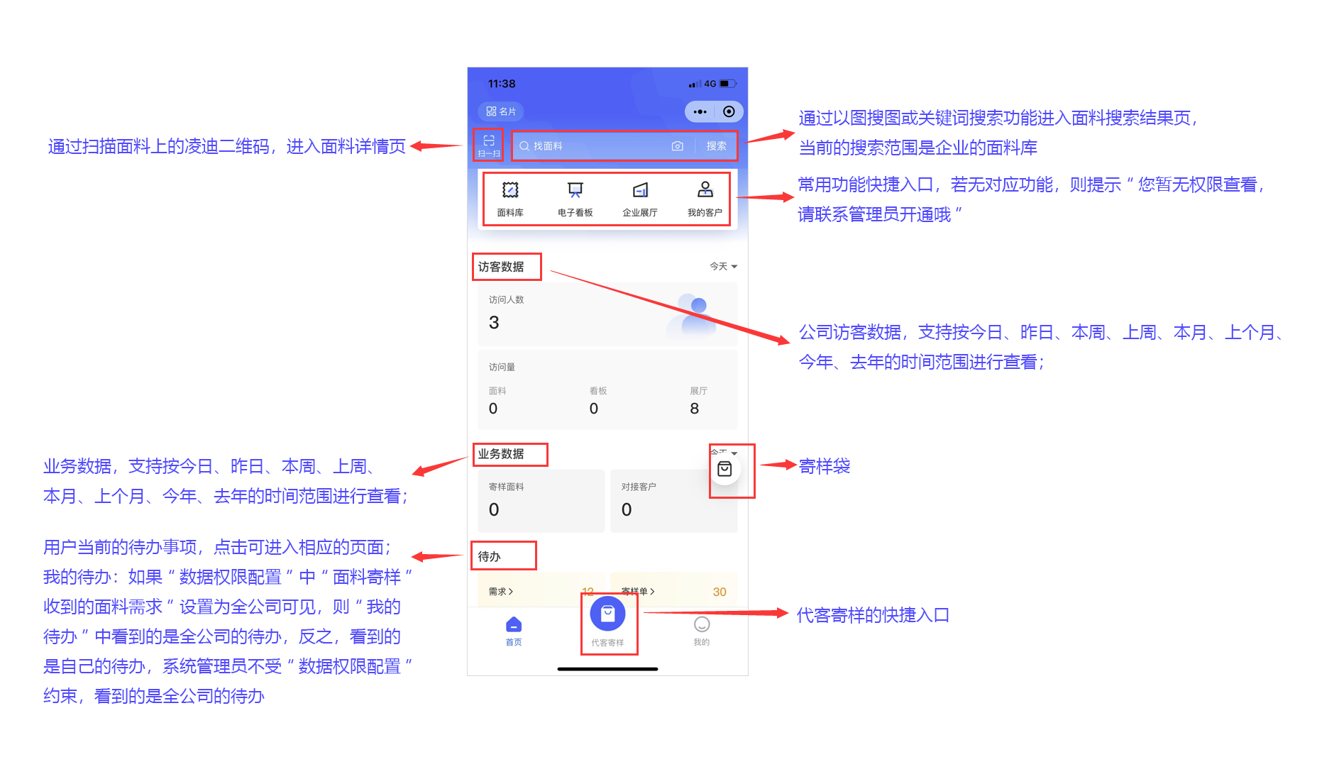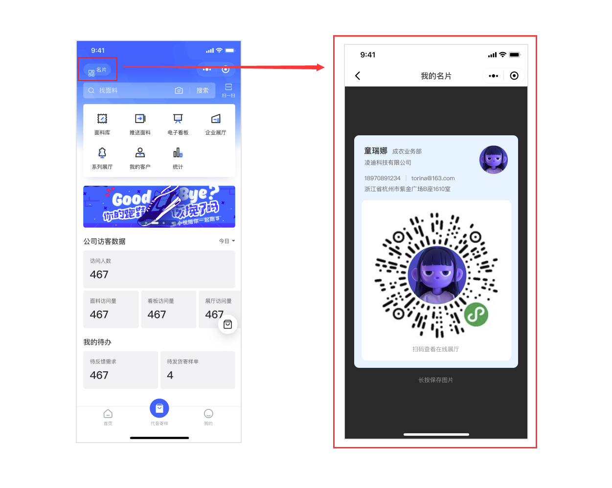 · 首页增加“我的名片”入口,点击则打开我的名片页面如下图,扫我的名片中的二维码进入企业展厅,客户通过这个二维码进入企业展厅后的申请寄样是归属到这个业务员的,会进入这个业务员的“寄样单”