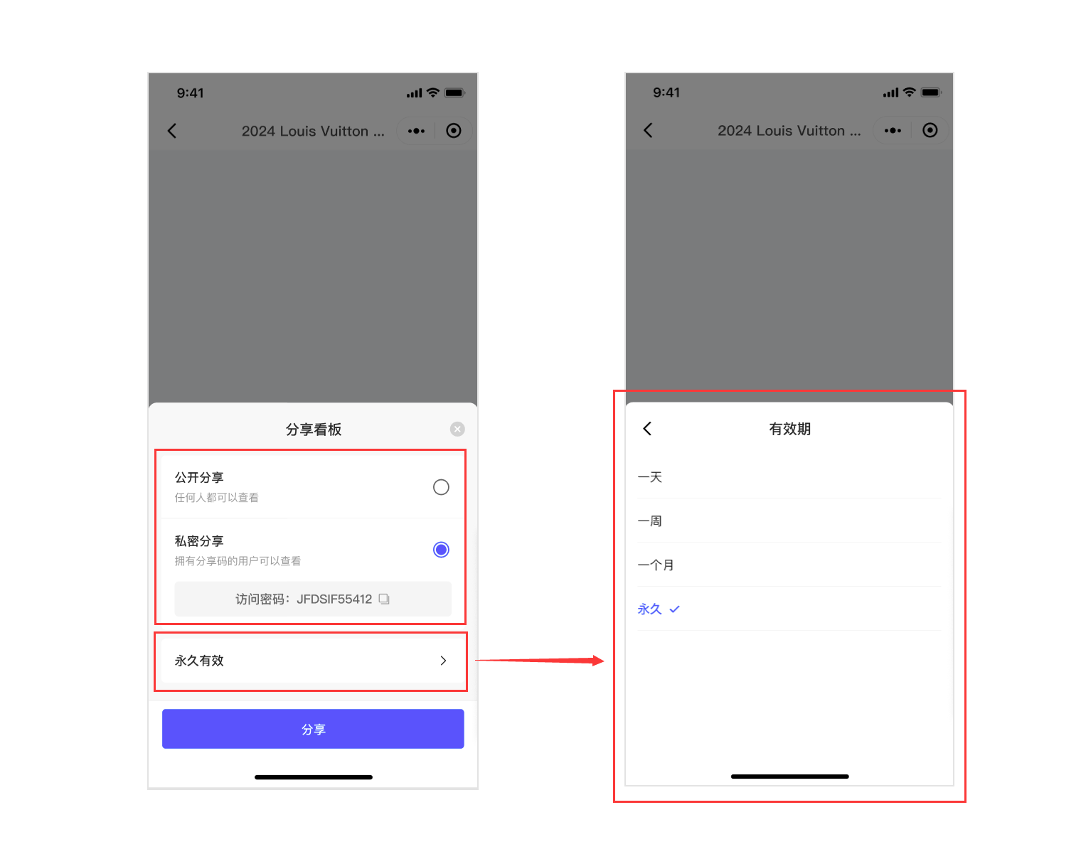 · 电子看板支持公开分享和私密分享,有效期支持选择一天、一周、一个月、永久