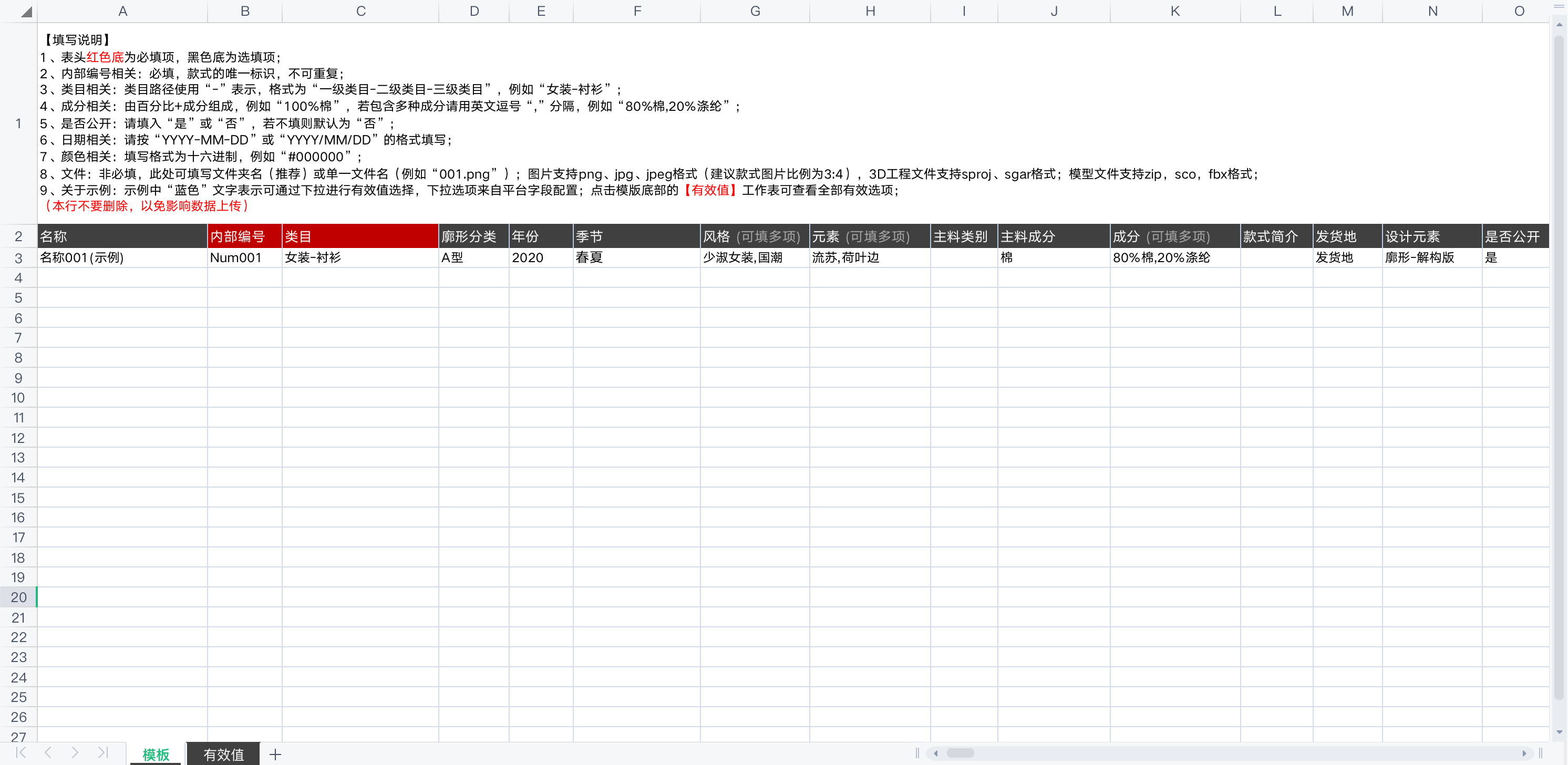 Excel模版效果如下,填写前请仔细阅读【填写说明】,并参考示例进行填写;上传时平台将从第三行开始读取数据,因此请勿删除【填写说明】部分,以免造成数据漏传;