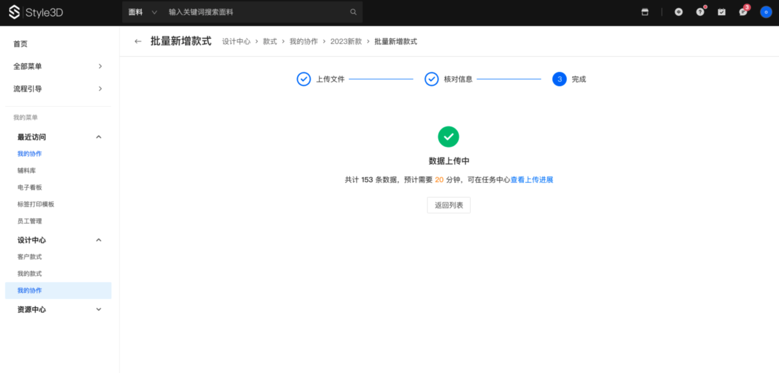 完成所有步骤后效果如下;您可在任务中心查看上传进展或返回继续上传(离开此页面不影响上传进程);