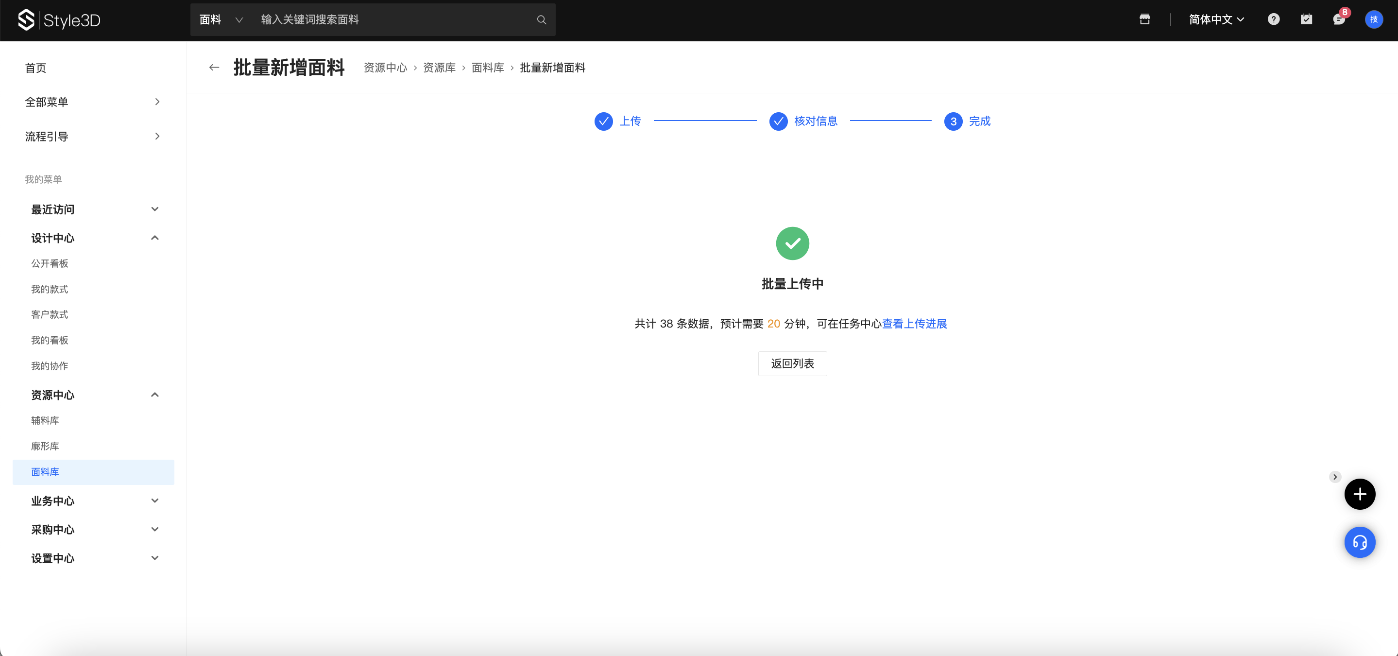 完成所有步骤后效果如下;您可在任务中心查看上传进展或返回继续上传(离开此页面不影响上传进程);