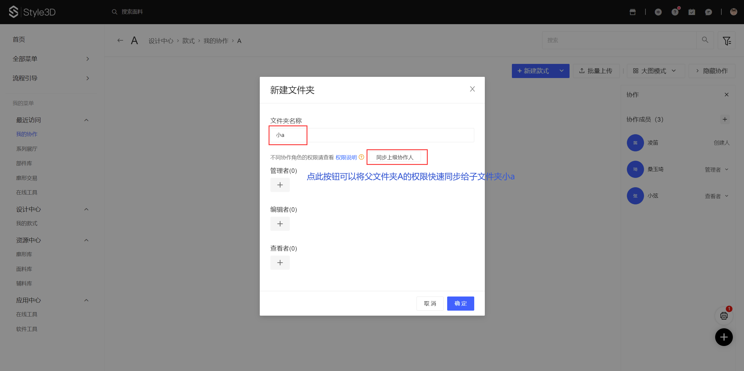子文件夹仅在第一次创建时可以通过【同步上级协作人】快速同步父文件夹的权限