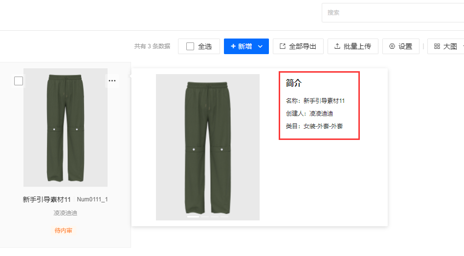款式、廓形、部件、面料、辅料,简介的显示位置有两个,如下图(以款式为例)