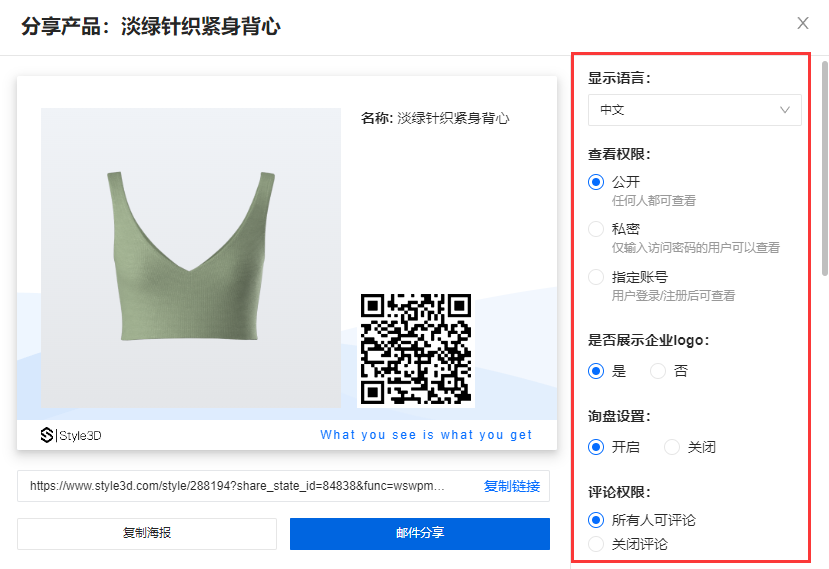 · 支持三种分享方式:链接、海报、邮件,可以在右侧红框区,设置分享的相关参数