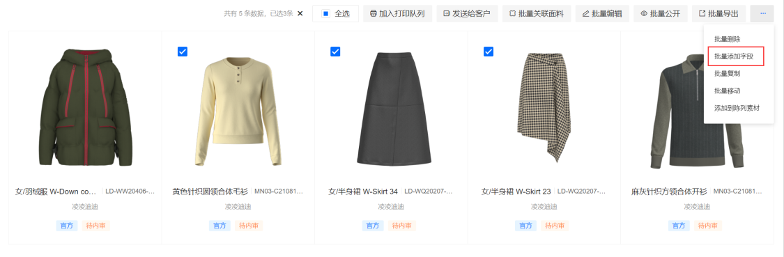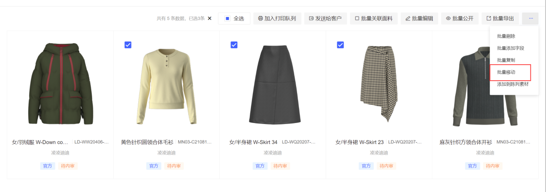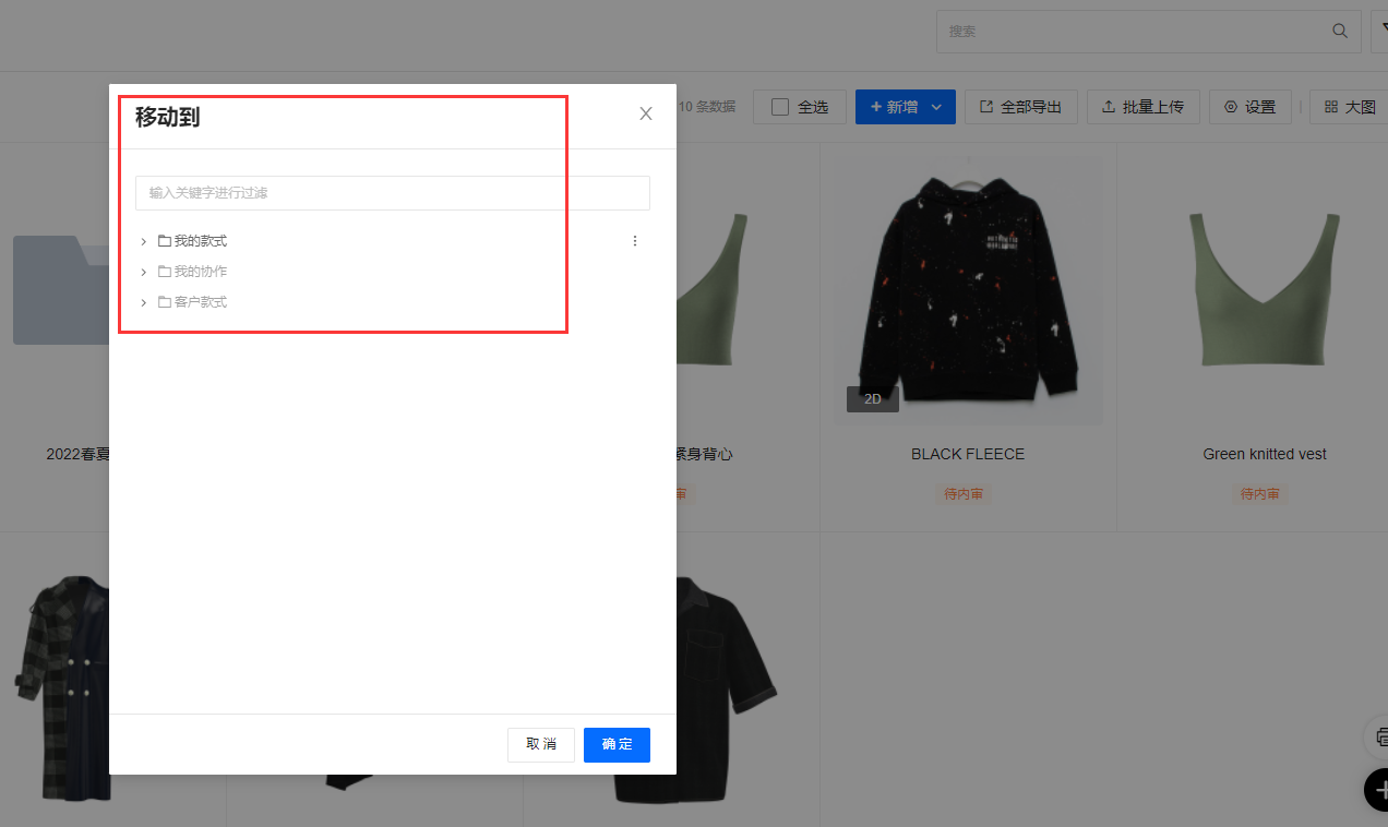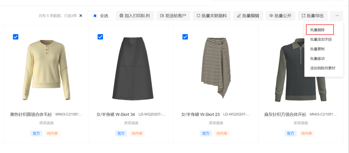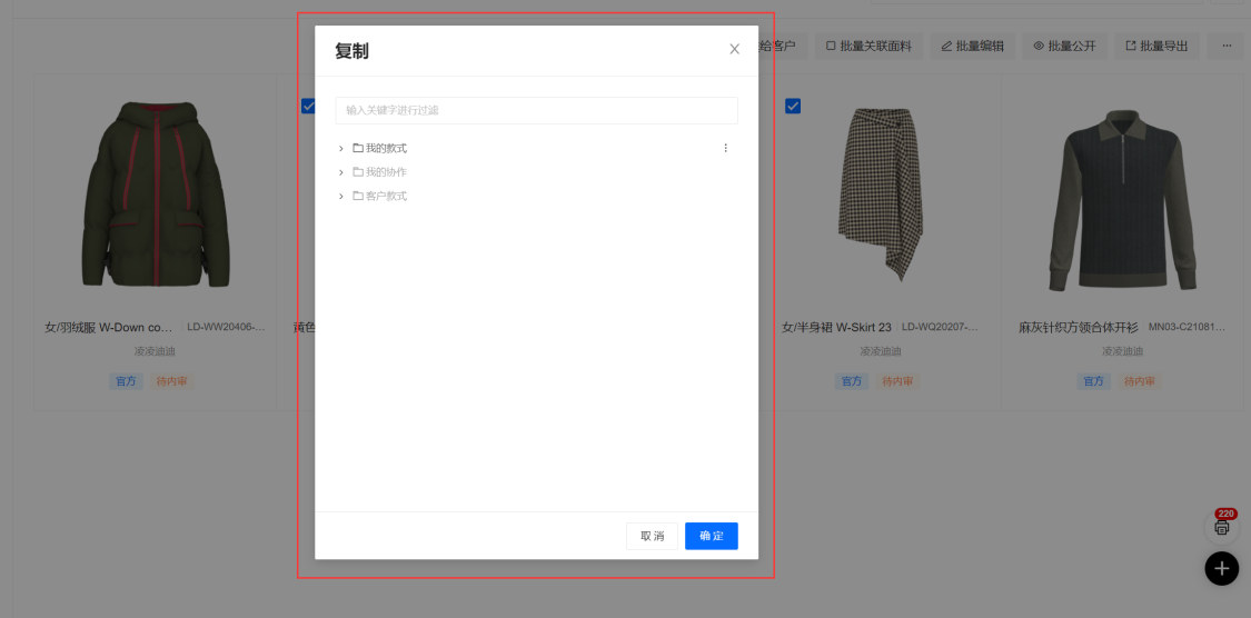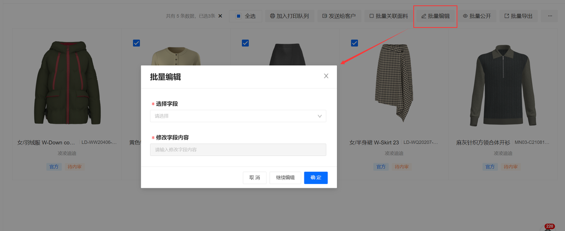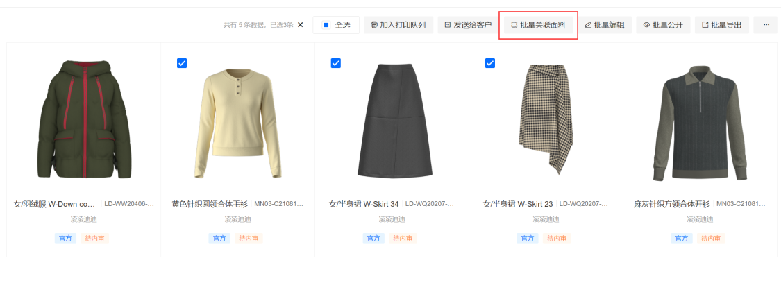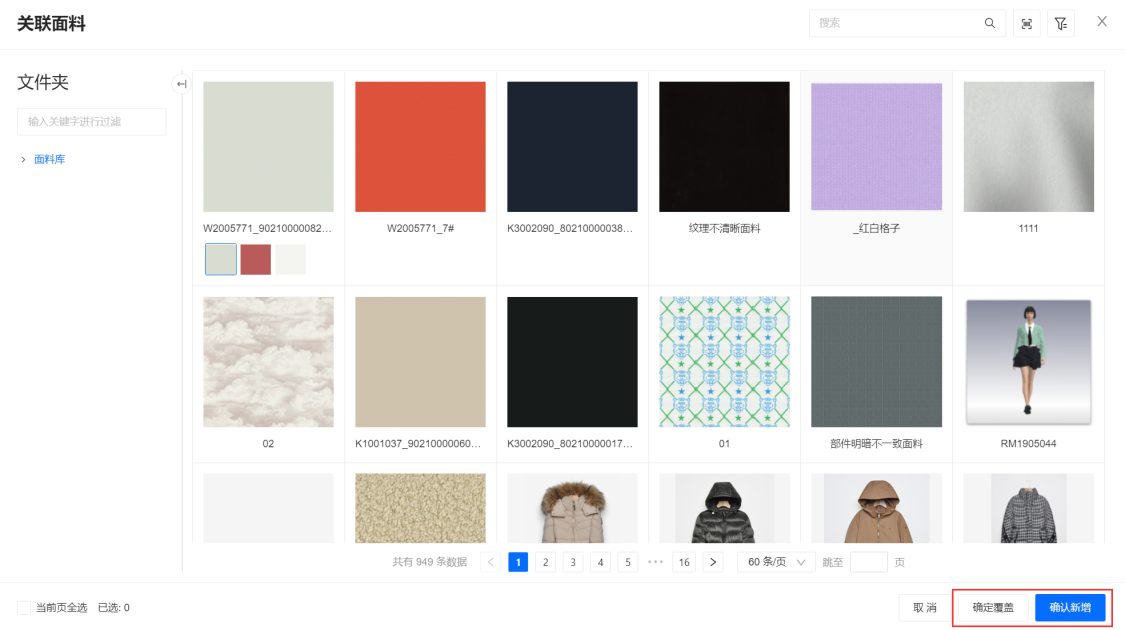确认覆盖:可以一次把多个款式原来关联的面料,更换成新选择的面料