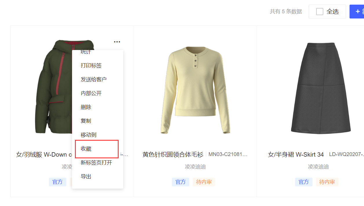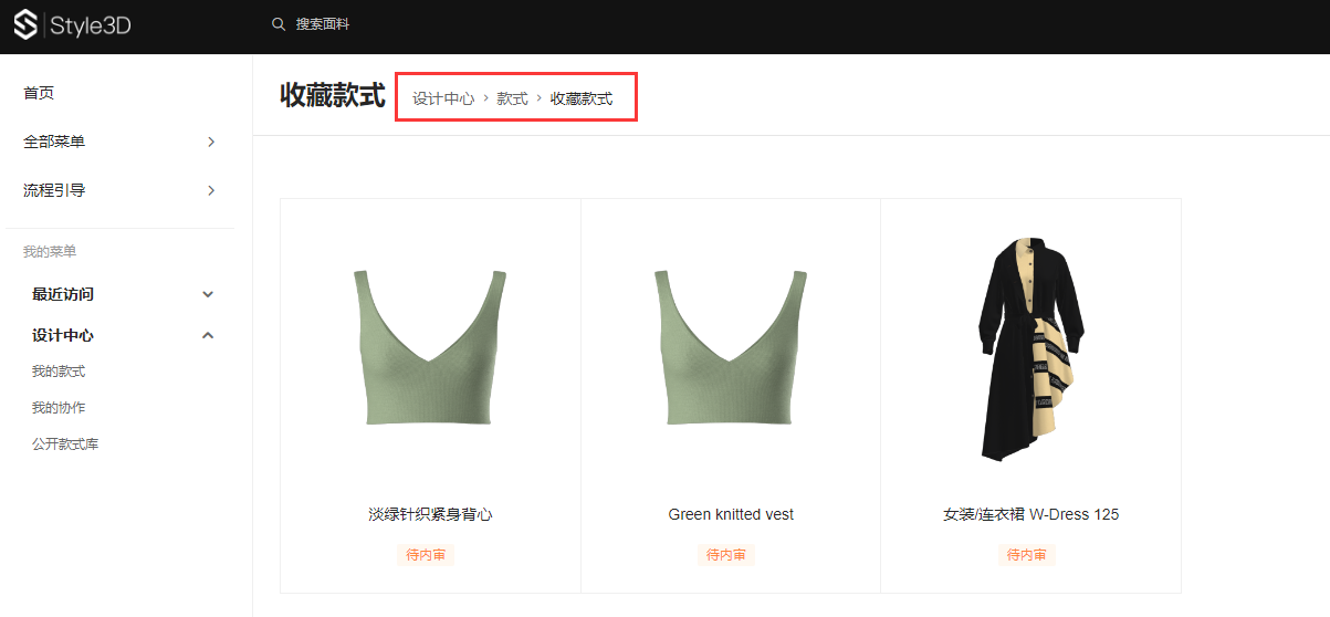 · 收藏后,款式会出现在【设计中心>款式>收藏款式】菜单中,原来的菜单中也还有