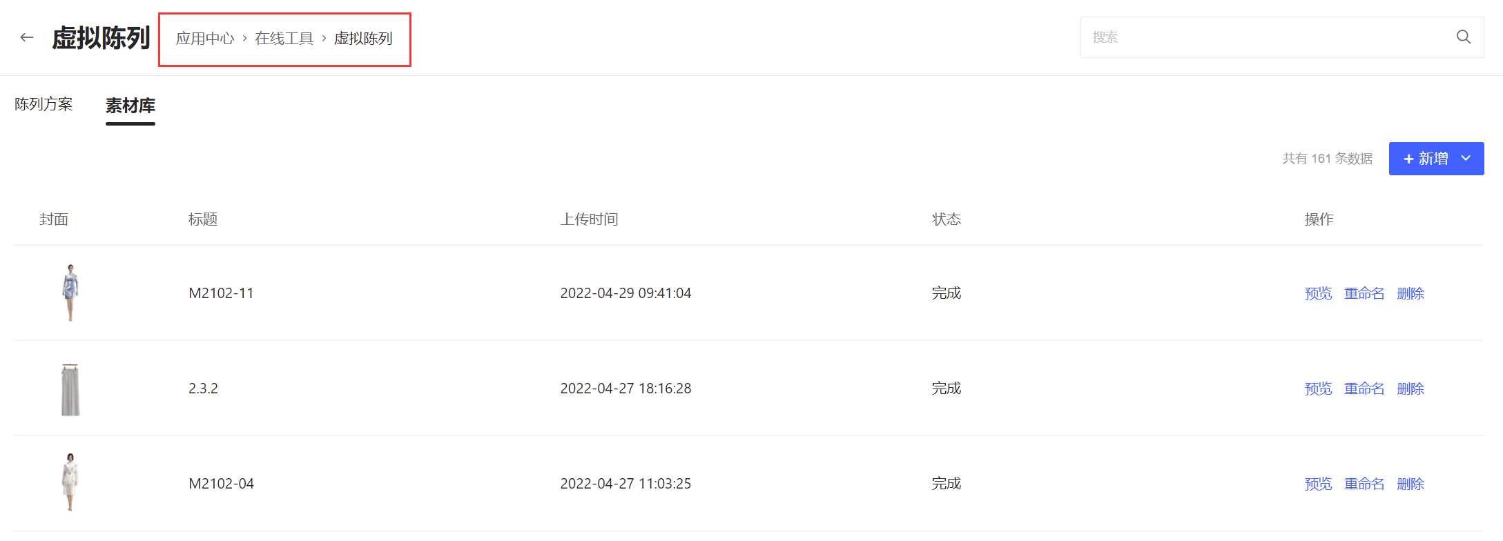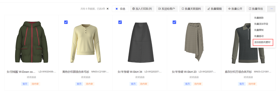 选中款式,点【添加到陈列素材】,会将选好的款式加入到虚拟陈列的素材库中