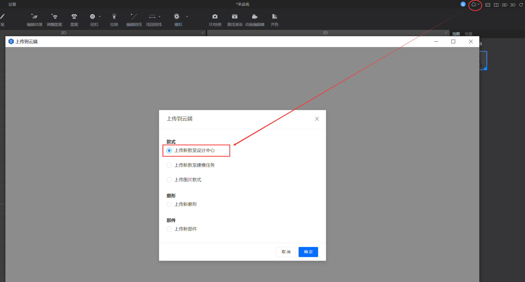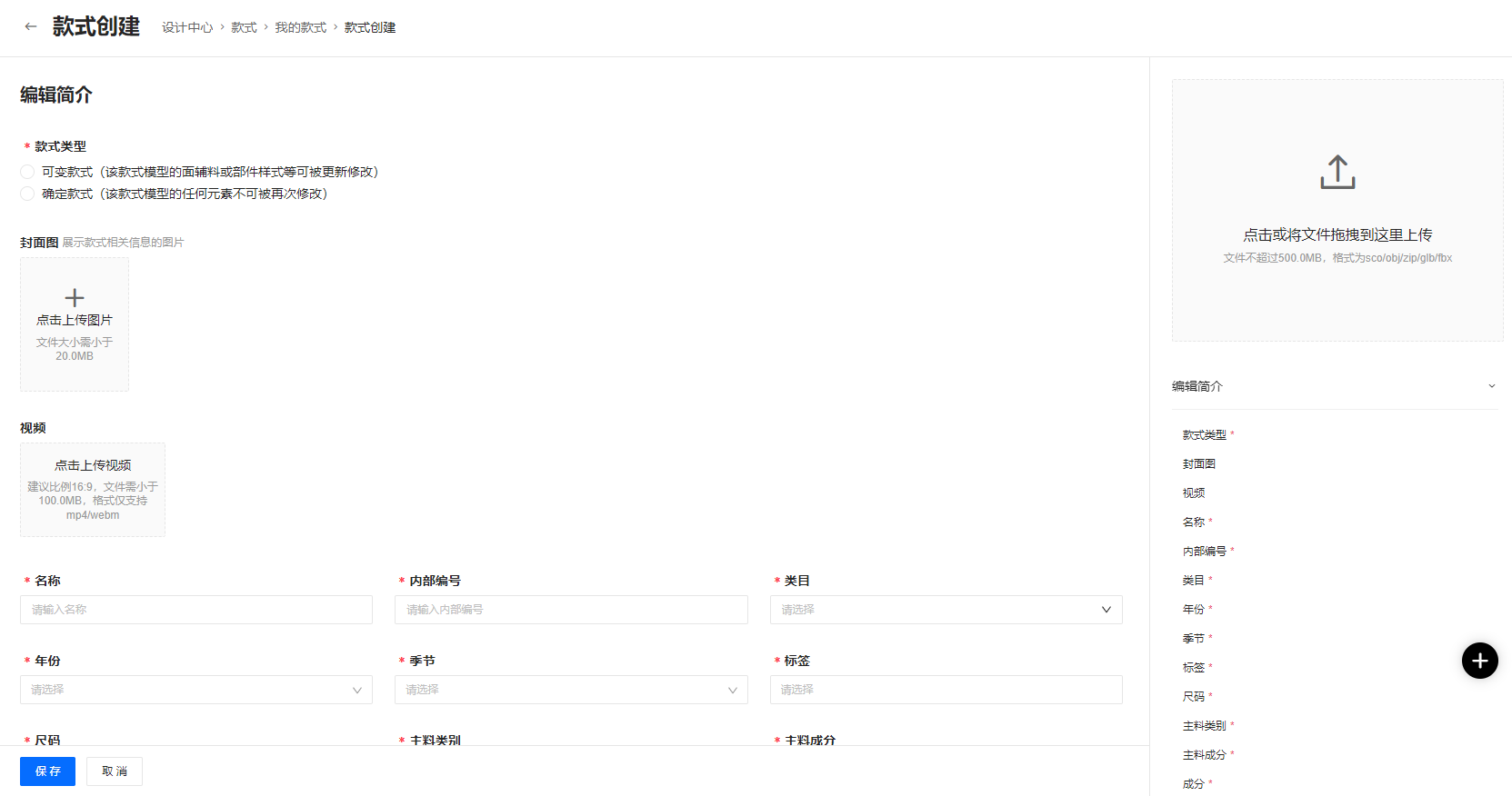 直接上传2D或者3D款式,选择这种方式上传时,打开款式创建页面,按照页面提示将对应的款式的文字、图片、工程文件等信息上传后点保存即可