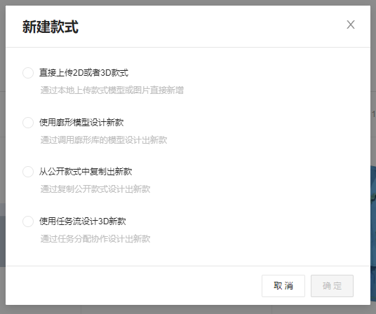 另外4种是通过登录Cloud平台上传,可以在【我的款式、我的协作、客户款式】中,通过【新增>新建款式】进行上传,如下图