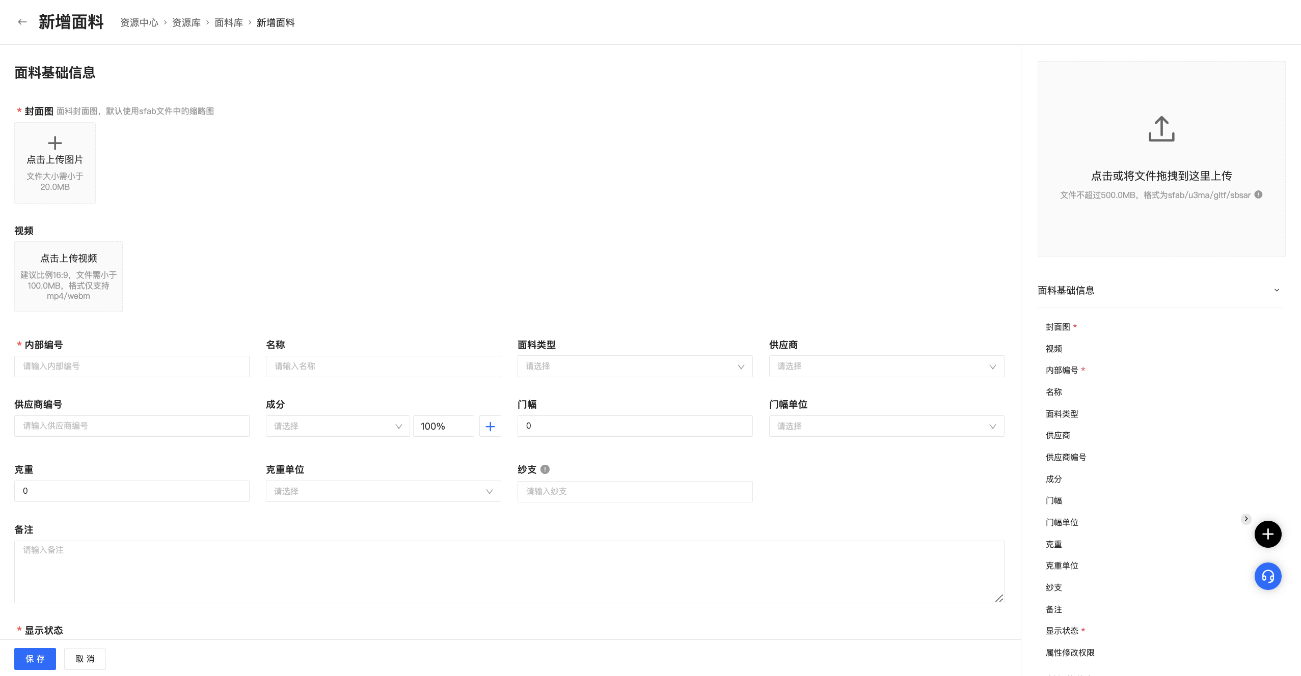填写面料信息,包括面料基础信息、面料规格信息、关联信息和附件