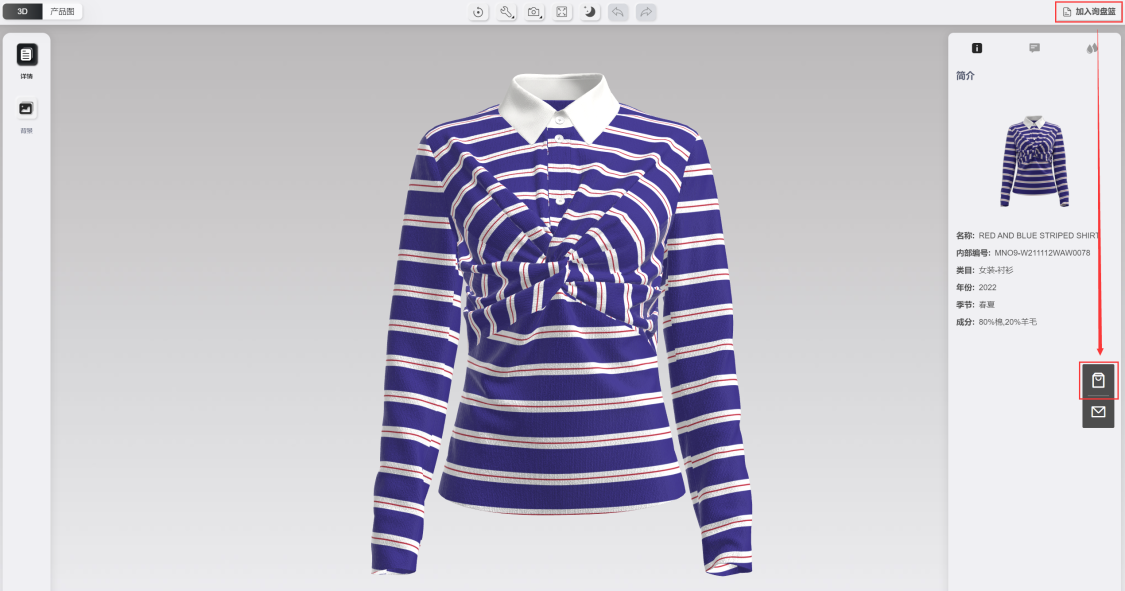 - 在图b上点击面料可打开图c,进入面料详情页,可在详情页更好的查看面料及将面料加入询盘篮