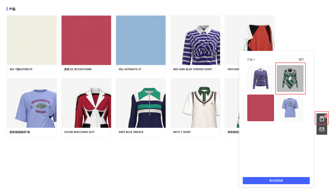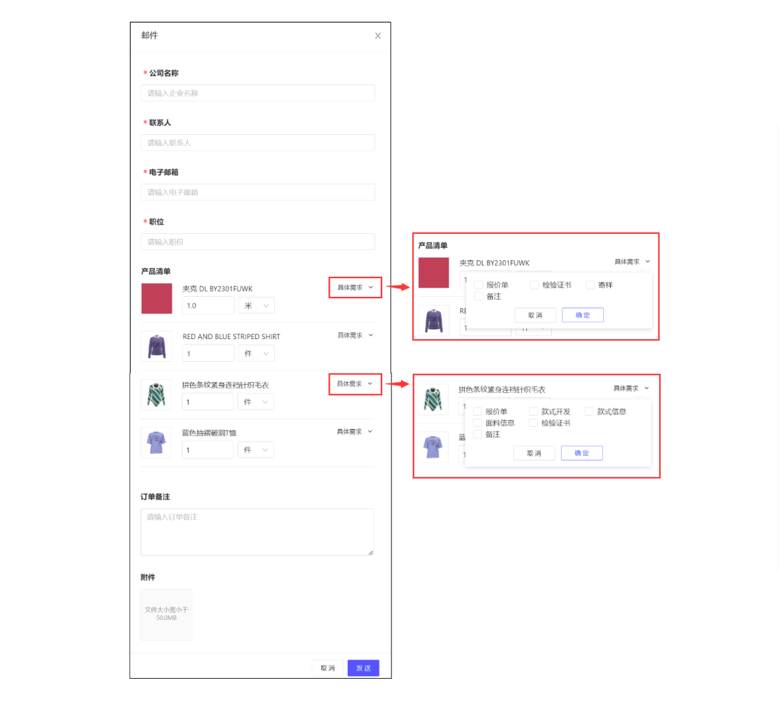 - 产品清单-具体需求:面料和款式可分别在具体需求处选择希望供应商提供的哪些信息给自己