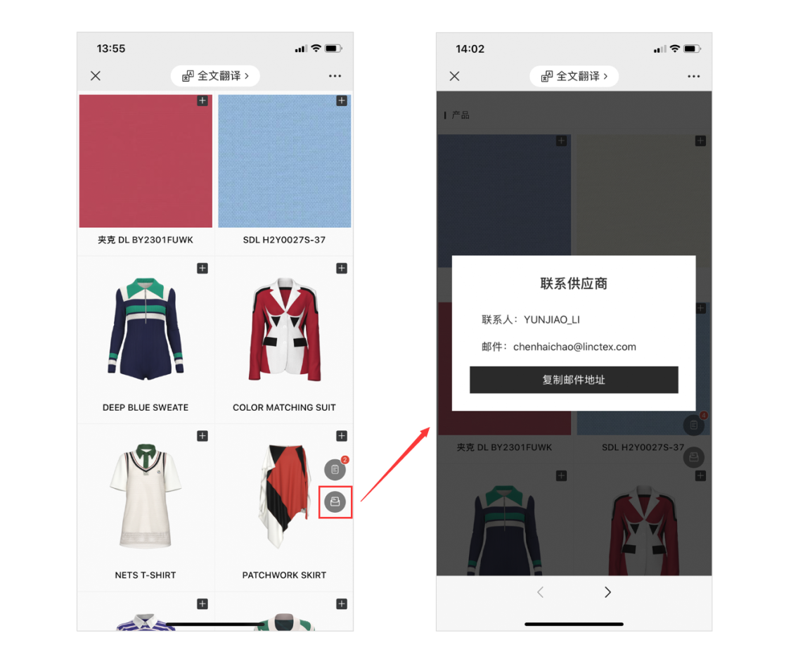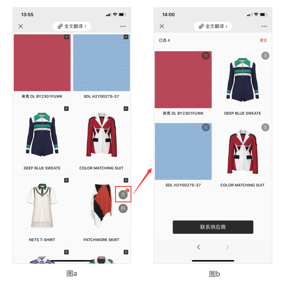 - 在图b上点击款式可打开图a,进入款式详情页,可在详情页更好的查看款式及将款式加入询盘篮