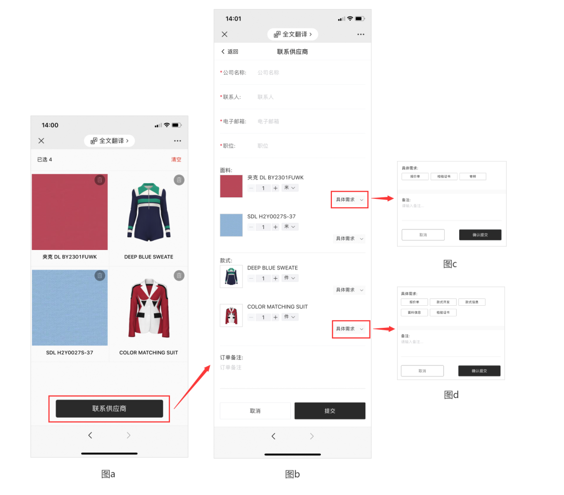 - 点击面料后面对应的【具体需求】,打开图c,选择希望供应商提供的哪些信息给自己