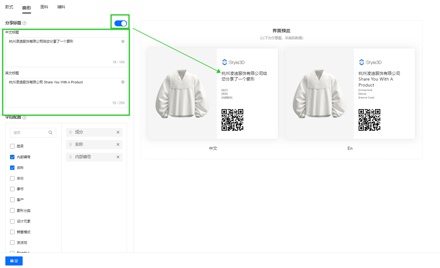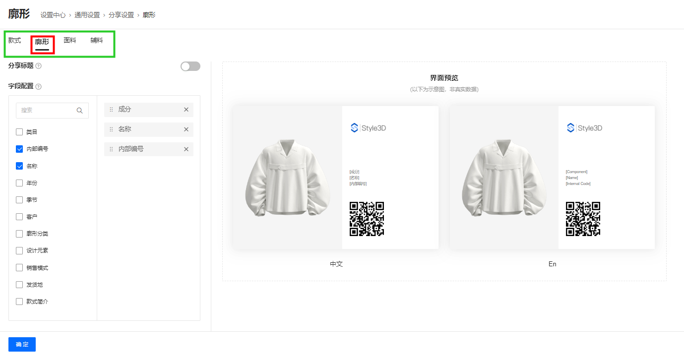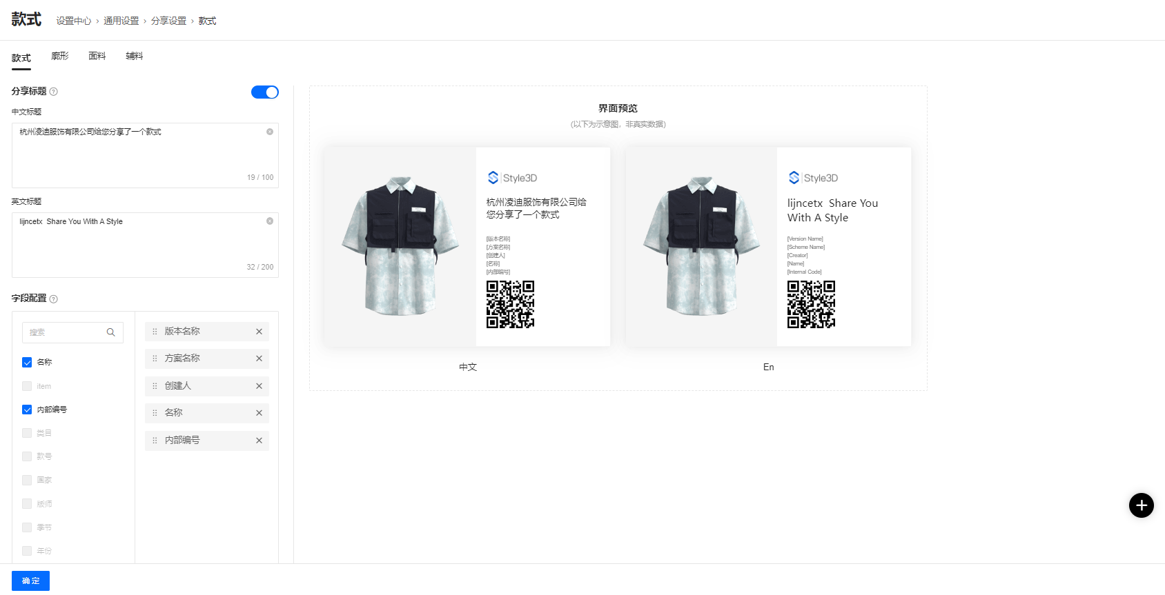 Cloud分享设置功能主要用于设置在款式、廓形、面料、辅料进行分享时分享界面内容,包括中英文的分享标题与字段配置等