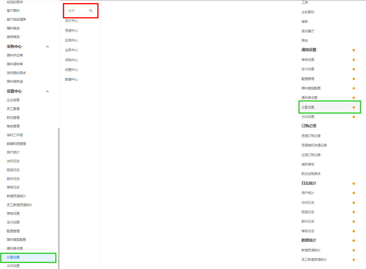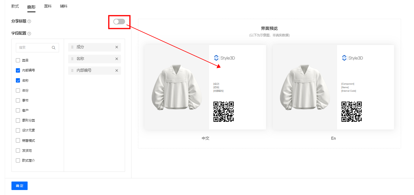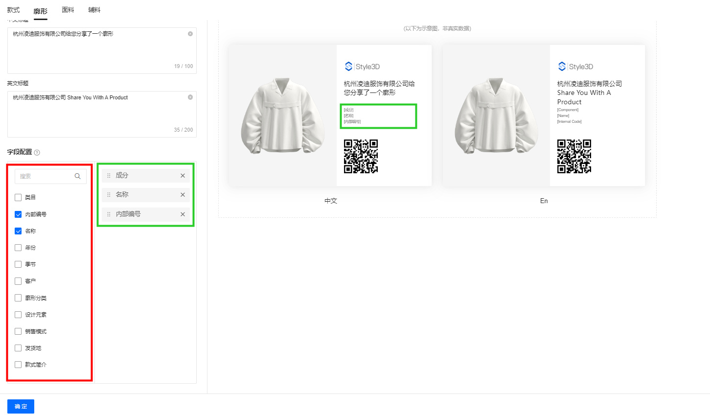 Cloud分享设置功能主要用于设置在款式、廓形、面料、辅料进行分享时分享界面内容,包括中英文的分享标题与字段配置等
