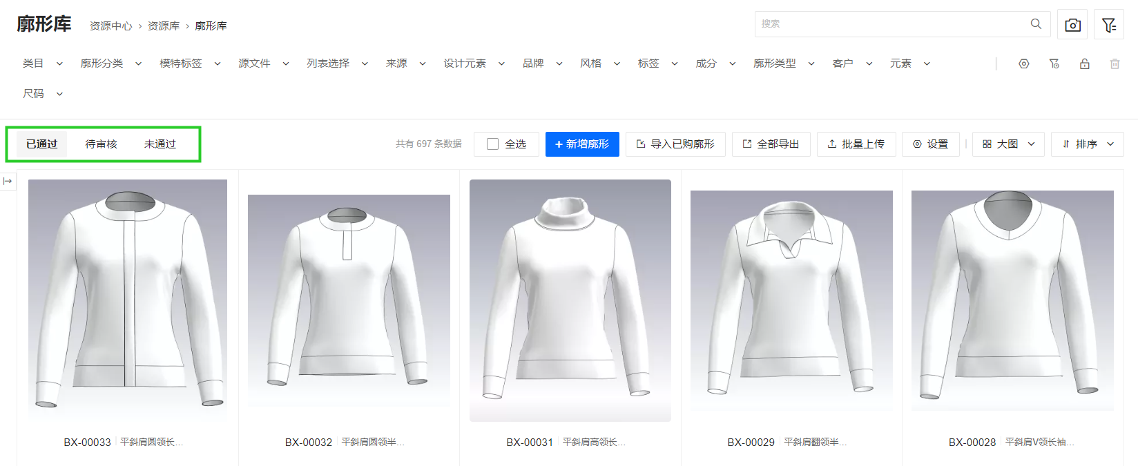 【新增审核】选择打开后,资源库左上角会出现【已通过】、【待审核】及【未通过】三种状态。