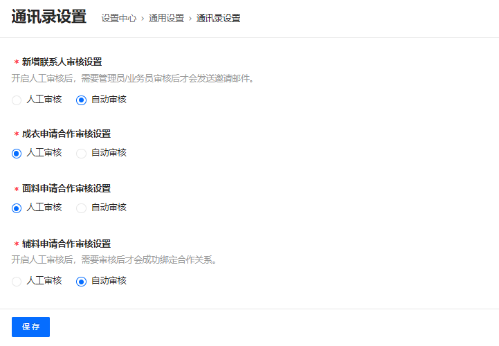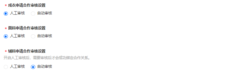 Cloud成衣、面料、辅料申请合作审核设置:可选择人工审核或自动审核,开启人工审核后,需要管理员/业务员审核后才会成功绑定合作关系,若开启自动审核则不需要管理员/业务员审核就可以绑定合作关系